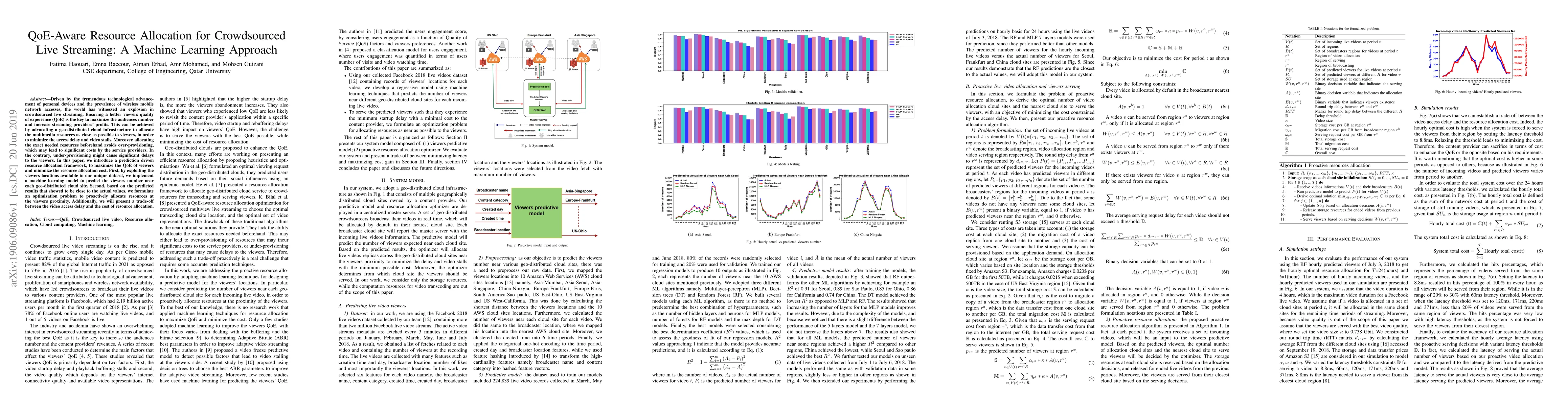 Driven by the tremendous technological advancement of personal devices and the prevalence of wireless mobile network accesses, the world has witnessed an explosion in crowdsourced live streaming. Ensuring a better viewers quality of experience (QoE) is the key to maximize the audiences number and increase streaming providers' profits. This can be achieved by advocating a geo-distributed cloud infrastructure to allocate the multimedia resources as close as possible to viewers, in order to minimize the access delay and video stalls. Moreover, allocating the exact needed resources beforehand avoids over-provisioning, which may lead to significant costs by the service providers. In the contrary, under-provisioning might cause significant delays to the viewers. In this paper, we introduce a prediction driven resource allocation framework, to maximize the QoE of viewers and minimize the resource allocation cost. First, by exploiting the viewers locations available in our unique dataset, we implement a machine learning model to predict the viewers number near each geo-distributed cloud site. Second, based on the predicted results that showed to be close to the actual values, we formulate an optimization problem to proactively allocate resources at the viewers proximity. Additionally, we will present a trade-off between the video access delay and the cost of resource allocation.