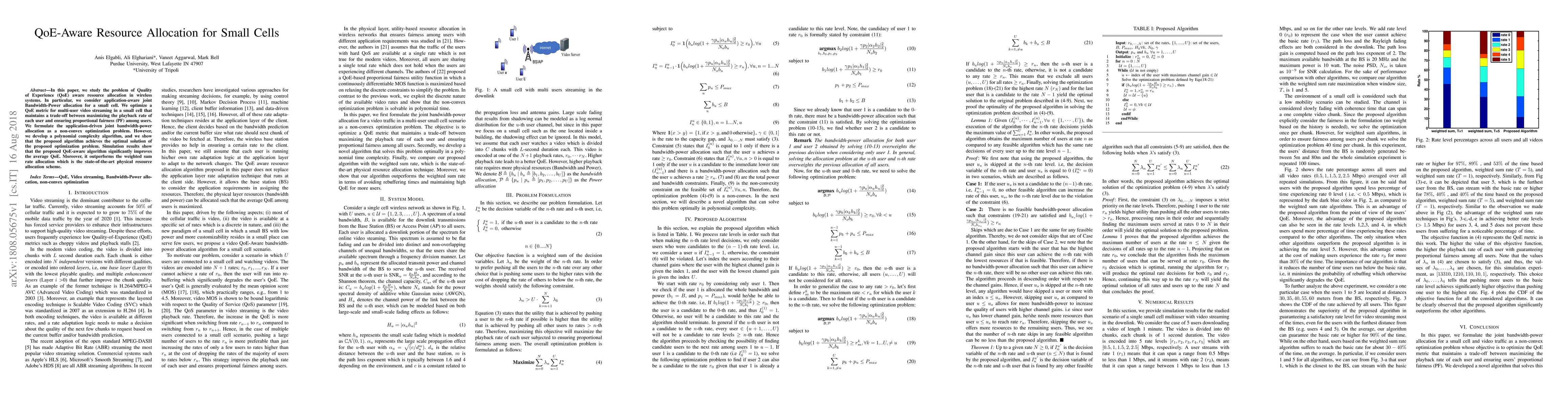 The paper formulates joint bandwidth-power allocation for a small cell and video traffic as a non-convex optimization problem, aiming to optimize a QoE metric that balances maximizing each user's playback rate with ensuring proportional fairness among users.