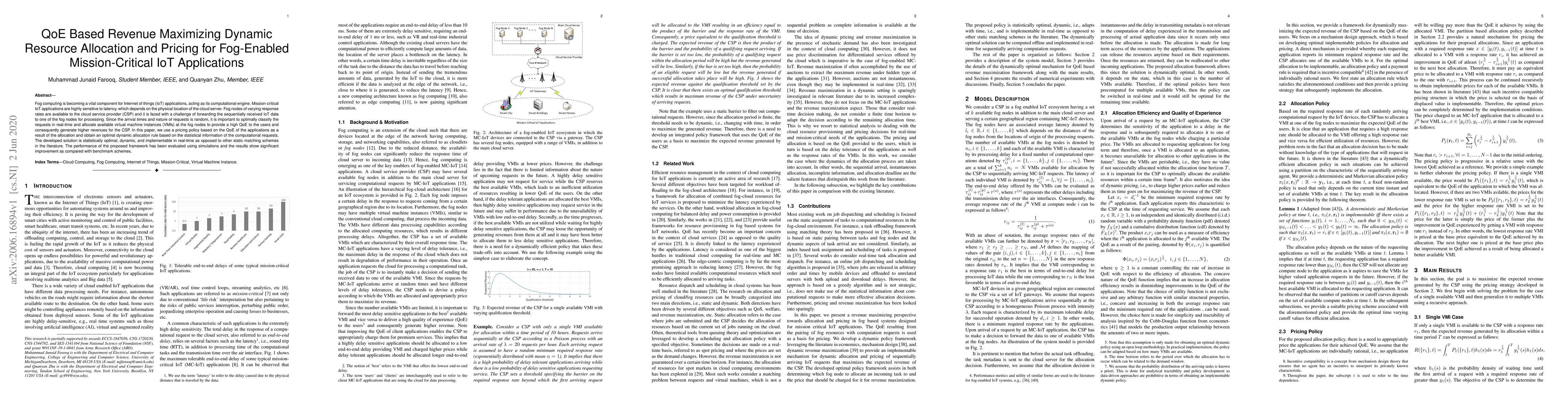 Fog computing is becoming a vital component for Internet of things (IoT) applications, acting as its computational engine. Mission-critical IoT applications are highly sensitive to latency, which depends on the physical location of the cloud server. Fog nodes of varying response rates are available to the cloud service provider (CSP) and it is faced with a challenge of forwarding the sequentially received IoT data to one of the fog nodes for processing. Since the arrival times and nature of requests is random, it is important to optimally classify the requests in real-time and allocate available virtual machine instances (VMIs) at the fog nodes to provide a high QoE to the users and consequently generate higher revenues for the CSP. In this paper, we use a pricing policy based on the QoE of the applications as a result of the allocation and obtain an optimal dynamic allocation rule based on the statistical information of the computational requests. The developed solution is statistically optimal, dynamic, and implementable in real-time as opposed to other static matching schemes in the literature. The performance of the proposed framework has been evaluated using simulations and the results show significant improvement as compared with benchmark schemes.