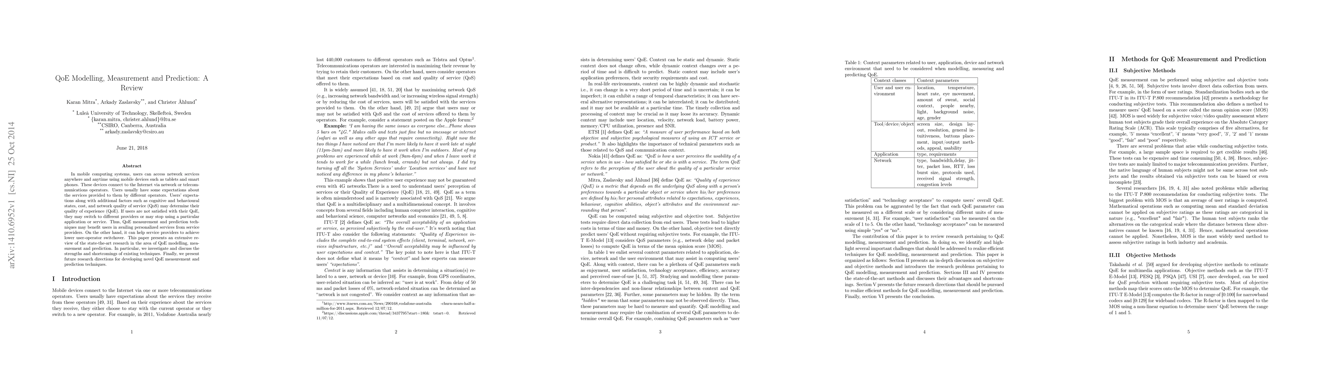 In mobile computing systems, users can access network services anywhere and anytime using mobile devices such as tablets and smart phones. These devices connect to the Internet via network or telecommunications operators. Users usually have some expectations about the services provided to them by different operators. Users' expectations along with additional factors such as cognitive and behavioural states, cost, and network quality of service (QoS) may determine their quality of experience (QoE). If users are not satisfied with their QoE, they may switch to different providers or may stop using a particular application or service. Thus, QoE measurement and prediction techniques may benefit users in availing personalized services from service providers. On the other hand, it can help service providers to achieve lower user-operator switchover. This paper presents a review of the state-the-art research in the area of QoE modelling, measurement and prediction. In particular, we investigate and discuss the strengths and shortcomings of existing techniques. Finally, we present future research directions for developing novel QoE measurement and prediction techniques