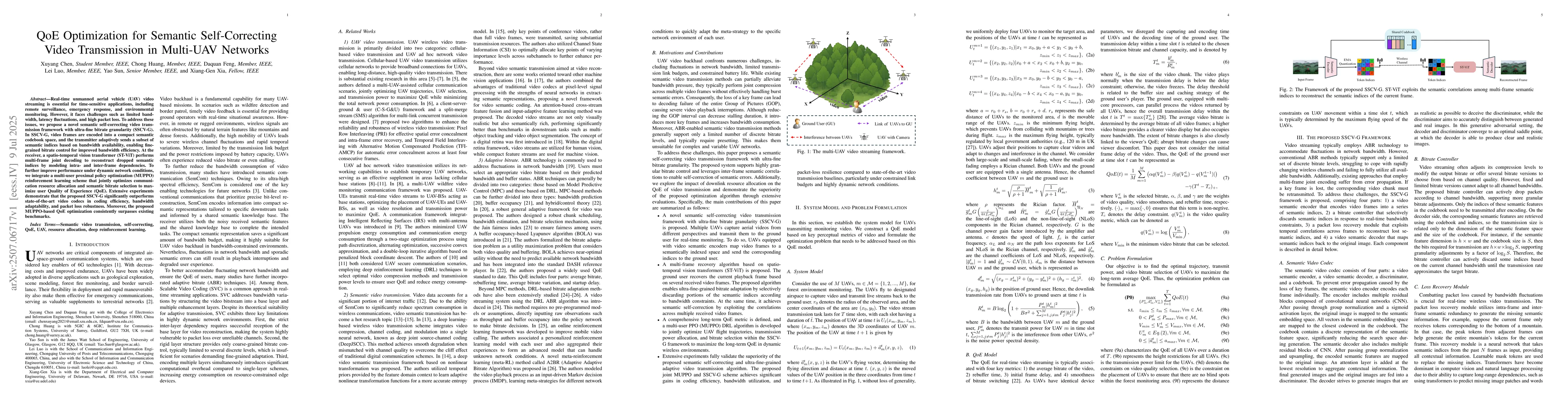Real-time unmanned aerial vehicle (UAV) video streaming is essential for time-sensitive applications, including remote surveillance, emergency response, and environmental monitoring. However, it faces challenges such as limited bandwidth, latency fluctuations, and high packet loss. To address these issues, we propose a novel semantic self-correcting video transmission framework with ultra-fine bitrate granularity (SSCV-G). In SSCV-G, video frames are encoded into a compact semantic codebook space, and the transmitter adaptively sends a subset of semantic indices based on bandwidth availability, enabling fine-grained bitrate control for improved bandwidth efficiency. At the receiver, a spatio-temporal vision transformer (ST-ViT) performs multi-frame joint decoding to reconstruct dropped semantic indices by modeling intra- and inter-frame dependencies. To further improve performance under dynamic network conditions, we integrate a multi-user proximal policy optimization (MUPPO) reinforcement learning scheme that jointly optimizes communication resource allocation and semantic bitrate selection to maximize user Quality of Experience (QoE). Extensive experiments demonstrate that the proposed SSCV-G significantly outperforms state-of-the-art video codecs in coding efficiency, bandwidth adaptability, and packet loss robustness. Moreover, the proposed MUPPO-based QoE optimization consistently surpasses existing benchmarks.