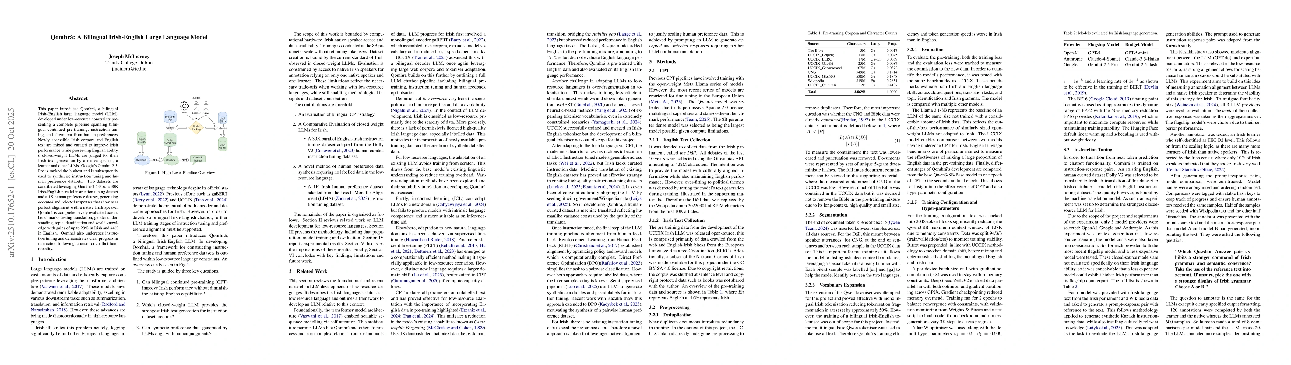 The paper presents an open-weight LLM pre-trained on Irish and English data, with techniques for bilingual pre-training and human preference optimization.