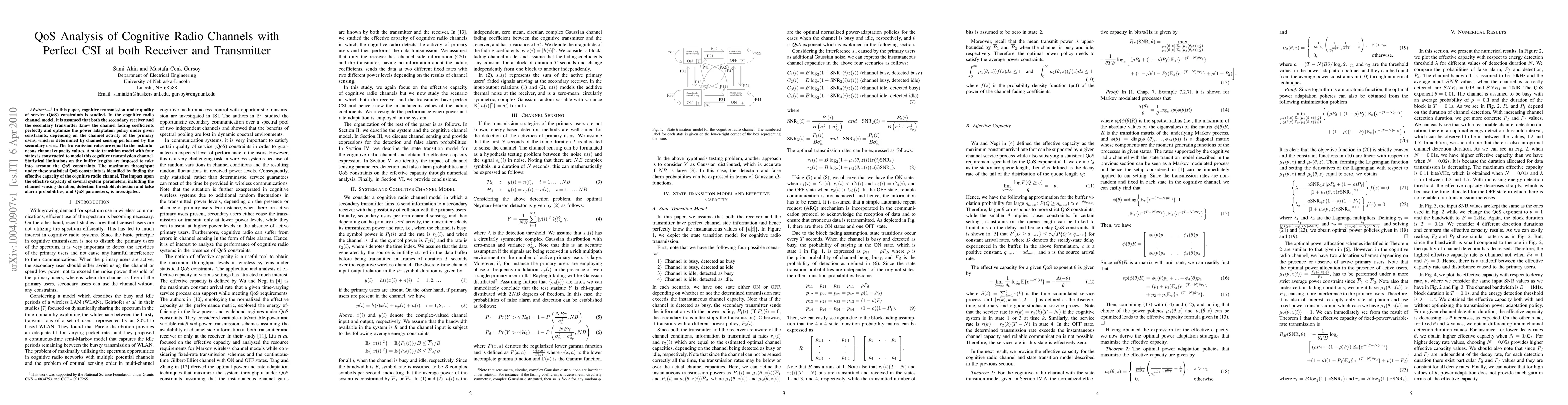 This paper analyzes cognitive radio channels under quality of service (QoS) constraints, assuming perfect channel state information (CSI) at both the receiver and transmitter. The study constructs a state transition model to optimize power adaptation, focusing on the effective capacity and the impact of various parameters on throughput under statistical QoS limitations.