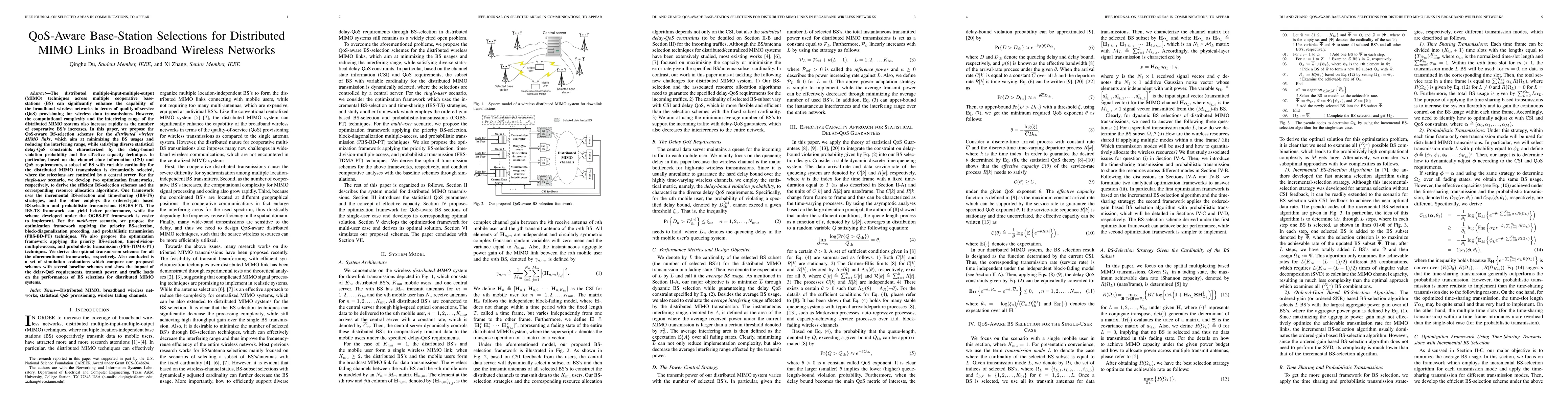 This research paper proposes QoS-aware base-station selection schemes for distributed MIMO links in broadband wireless networks to minimize BS usage while meeting diverse delay-QoS constraints.