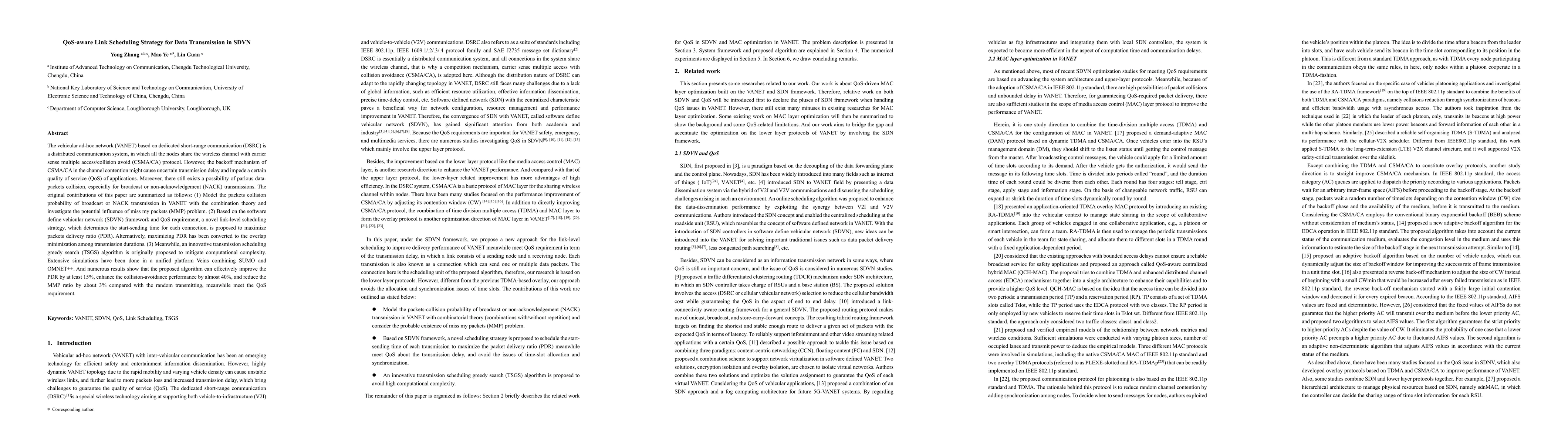 This paper proposes a QoS-aware link scheduling strategy for data transmission in SDVN-based VANETs to improve packet delivery ratio and reduce collisions. The authors introduce a novel scheduling strategy and a TSGS algorithm to minimize transmission overlaps, achieving at least a 15% improvement in PDR, a 40% enhancement in collision avoidance, and a 3% reduction in the MMP ratio compared to random transmission.