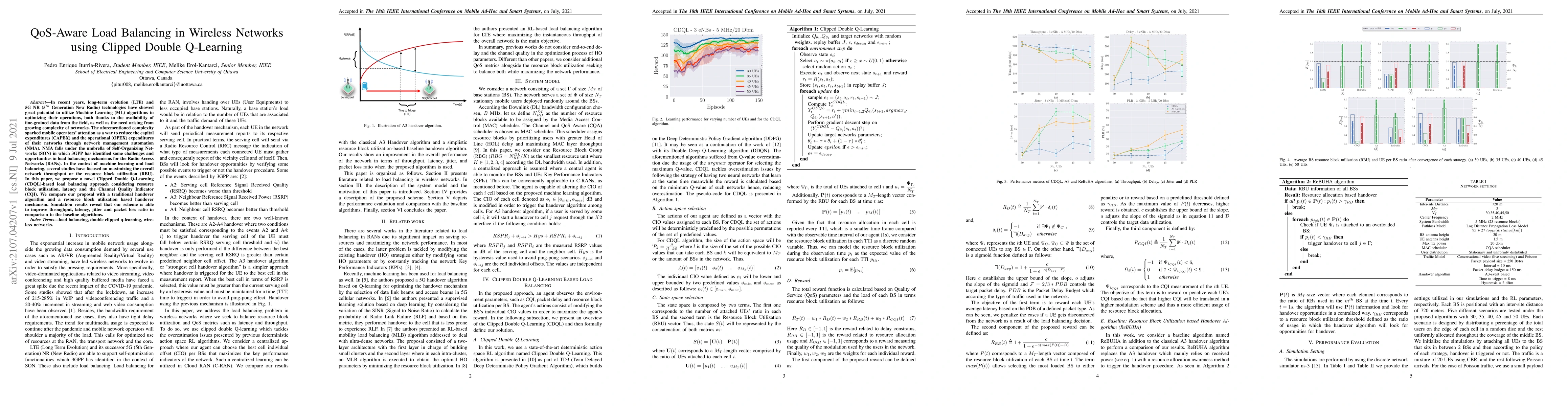 This paper proposes a Clipped Double Q-Learning (CDQL)-based load balancing approach for LTE and 5G NR networks, optimizing for resource block utilization, latency, and Channel Quality Indicator (CQI). Simulation results show that the proposed method improves throughput, latency, jitter, and packet loss compared to traditional handover algorithms.
