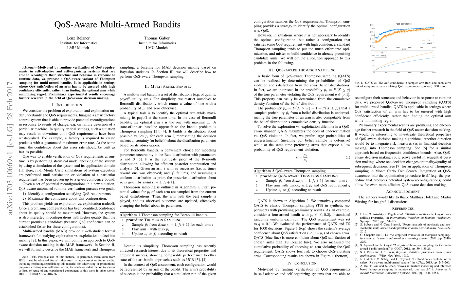 Motivated by runtime verification of QoS requirements in self-adaptive and self-organizing systems that are able to reconfigure their structure and behavior in response to runtime data, we propose a QoS-aware variant of Thompson sampling for multi-armed bandits. It is applicable in settings where QoS satisfaction of an arm has to be ensured with high confidence efficiently, rather than finding the optimal arm while minimizing regret. Preliminary experimental results encourage further research in the field of QoS-aware decision making.