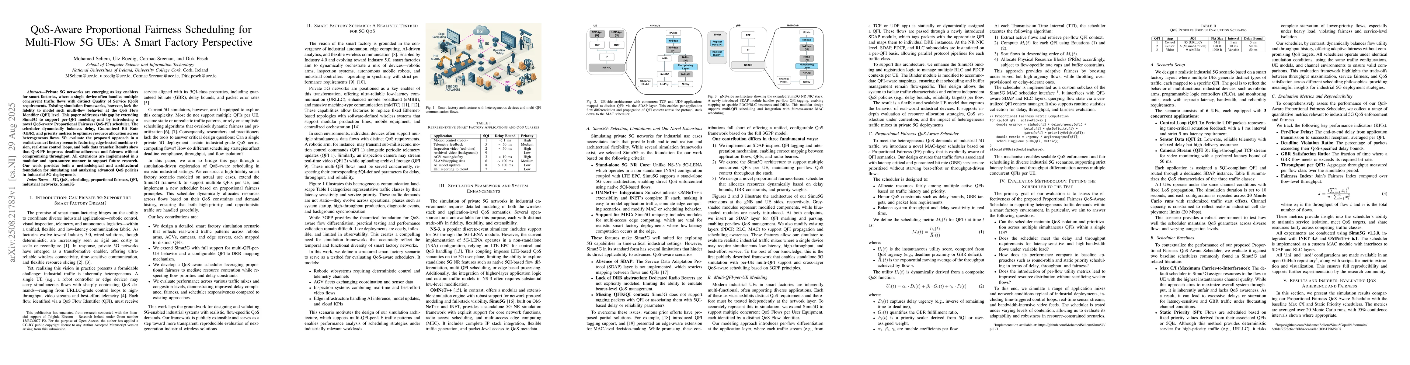 Private 5G networks are emerging as key enablers for smart factories, where a single device often handles multiple concurrent traffic flows with distinct Quality of Service (QoS) requirements. Existing simulation frameworks, however, lack the fidelity to model such multi-flow behavior at the QoS Flow Identifier (QFI) level. This paper addresses this gap by extending Simu5G to support per-QFI modeling and by introducing a novel QoS-aware Proportional Fairness (QoS-PF) scheduler. The scheduler dynamically balances delay, Guaranteed Bit Rate (GBR), and priority metrics to optimize resource allocation across heterogeneous flows. We evaluate the proposed approach in a realistic smart factory scenario featuring edge-hosted machine vision, real-time control loops, and bulk data transfer. Results show that QoS-PF improves deadline adherence and fairness without compromising throughput. All extensions are implemented in a modular and open-source manner to support future research. Our work provides both a methodological and architectural foundation for simulating and analyzing advanced QoS policies in industrial 5G deployments.