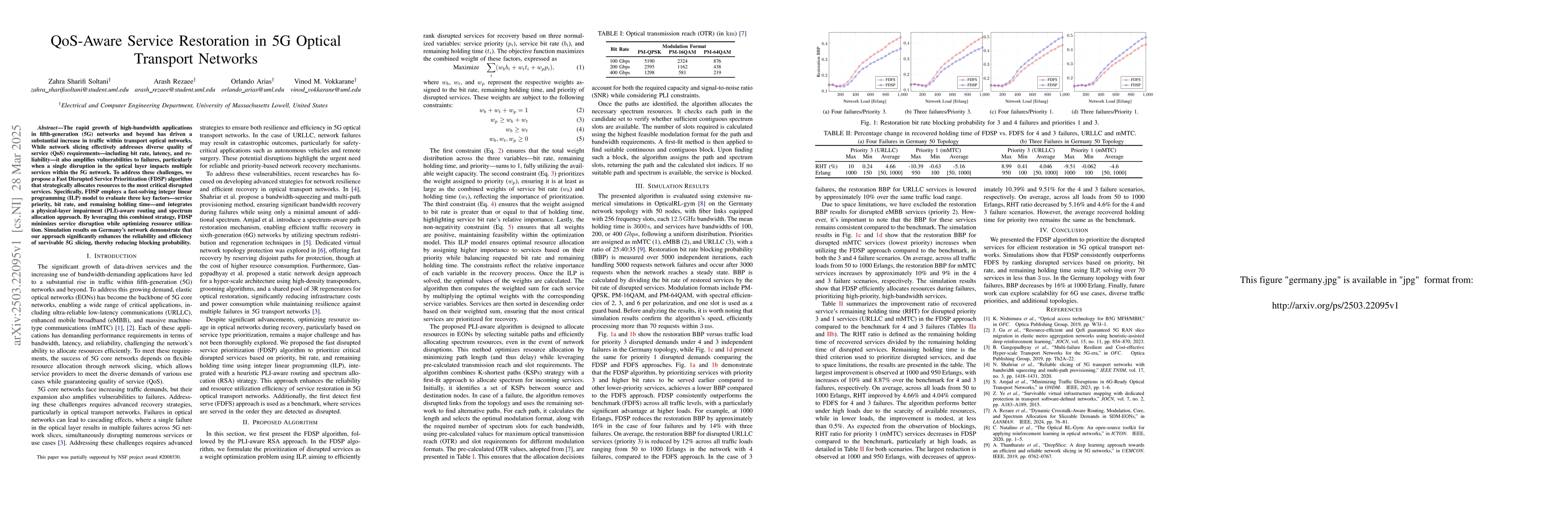 Only the chairs can edit The rapid growth of high-bandwidth applications in fifth-generation (5G) networks and beyond has driven a substantial increase in traffic within transport optical networks. While network slicing effectively addresses diverse quality of service (QoS) requirements-including bit rate, latency, and reliability-it also amplifies vulnerabilities to failures, particularly when a single disruption in the optical layer impacts multiple services within the 5G network. To address these challenges, we propose a Fast Disrupted Service Prioritization (FDSP) algorithm that strategically allocates resources to the most critical disrupted services. Specifically, FDSP employs a fast-solving integer linear programming (ILP) model to evaluate three key factors-service priority, bit rate, and remaining holding time-and integrates a physical-layer impairment (PLI)-aware routing and spectrum allocation approach. By leveraging this combined strategy, FDSP minimizes service disruption while optimizing resource utilization. Simulation results on Germany's network demonstrate that our approach significantly enhances the reliability and efficiency of survivable 5G slicing, thereby reducing blocking probability.