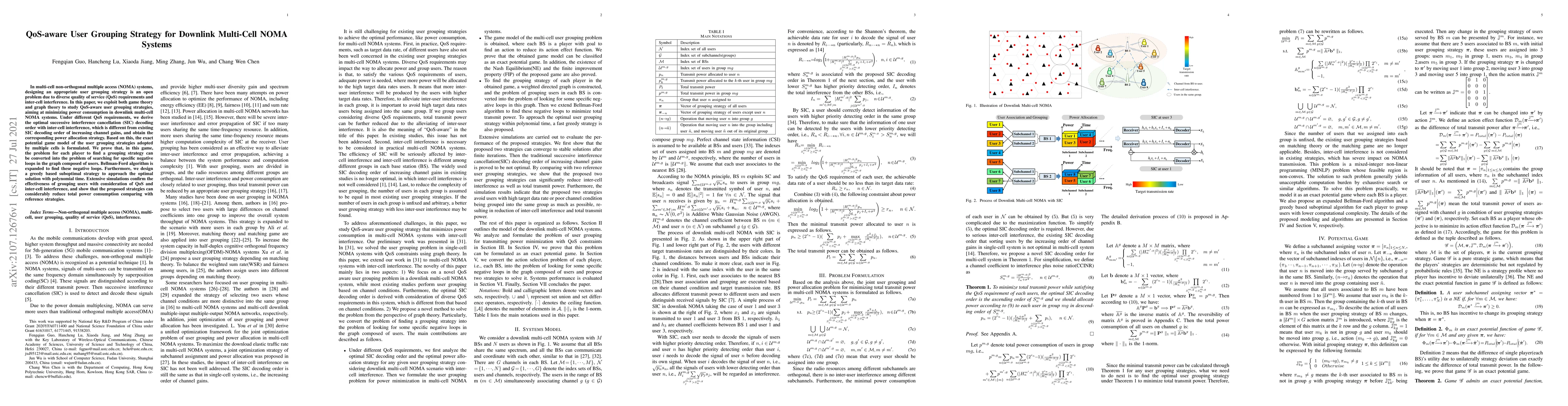 This paper proposes a QoS-aware user grouping strategy for downlink multi-cell NOMA systems using game and graph theory to minimize power consumption. The authors derive an optimal successive interference cancellation decoding order and formulate a potential game model to find the best grouping strategies, employing the Bellman-Ford algorithm and a greedy suboptimal approach to achieve significant power savings.