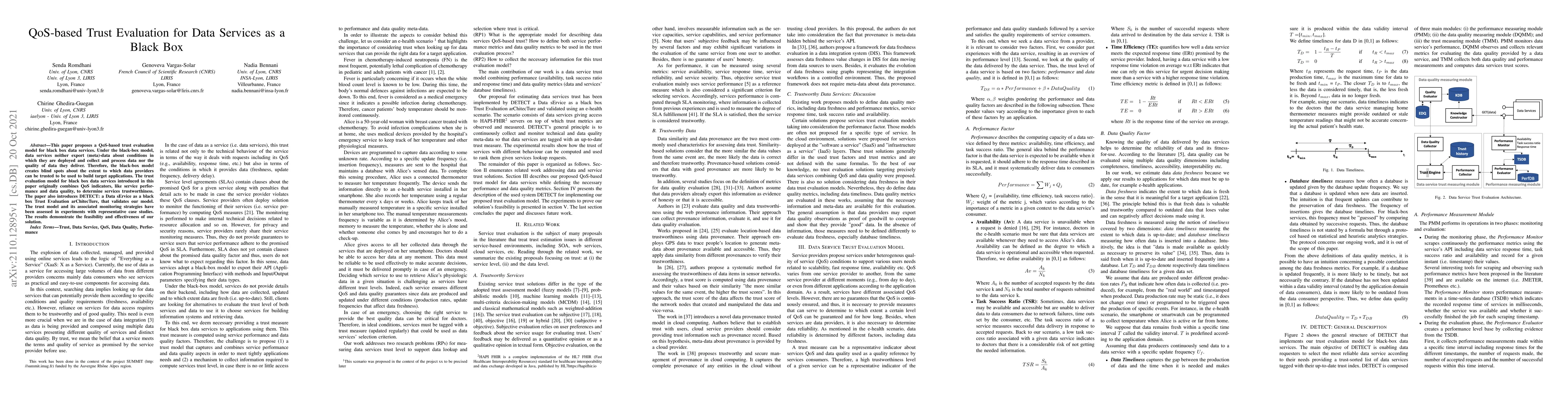 This paper introduces a QoS-based trust evaluation model for black box data services, which combines service performance and data quality indicators to assess trustworthiness. The proposed DETECT architecture validates the model, and experimental results show its feasibility and effectiveness.