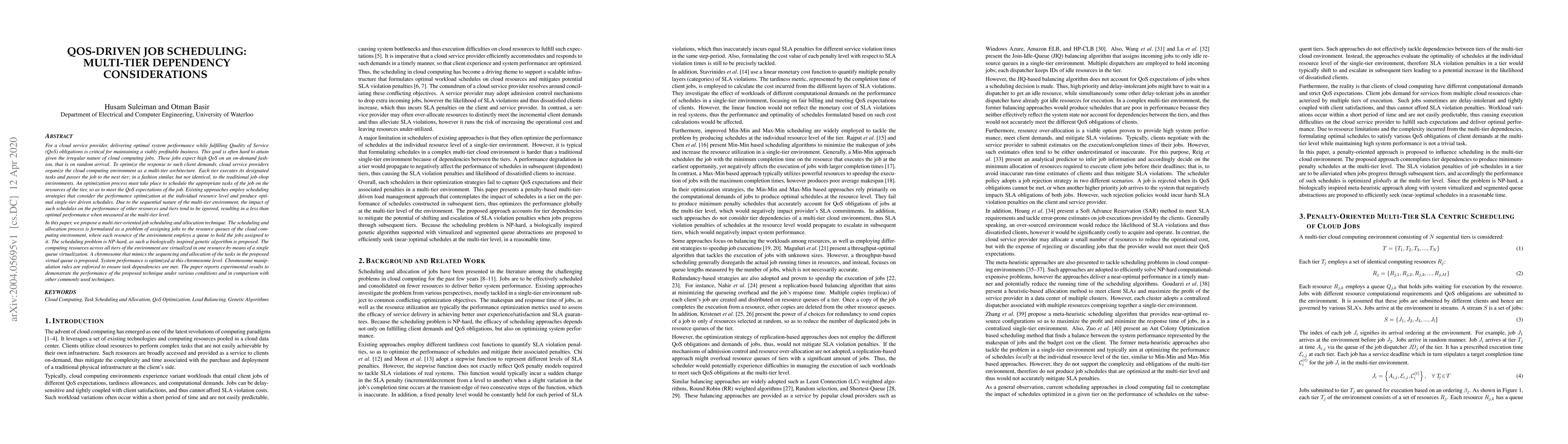 This paper proposes a multi-tier job scheduling technique to optimize Quality of Service (QoS) in cloud computing environments. It addresses the limitations of existing single-tier scheduling methods by introducing a genetic algorithm to handle the NP-hard scheduling problem, ensuring optimal performance across all tiers.