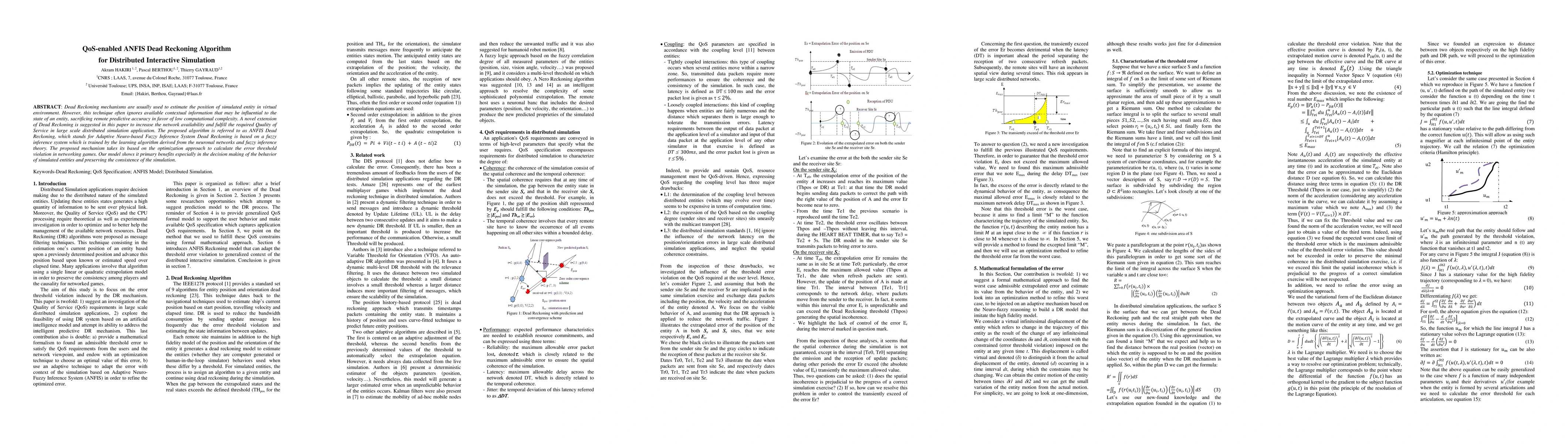 Dead Reckoning mechanisms are usually used to estimate the position of simulated entity in virtual environment. However, this technique often ignores available contextual information that may be influential to the state of an entity, sacrificing remote predictive accuracy in favor of low computational complexity. A novel extension of Dead Reckoning is suggested in this paper to increase the network availability and fulfill the required Quality of Service in large scale distributed simulation application. The proposed algorithm is referred to as ANFIS Dead Reckoning, which stands for Adaptive Neuro-based Fuzzy Inference System Dead Reckoning is based on a fuzzy inference system which is trained by the learning algorithm derived from the neuronal networks and fuzzy inference theory. The proposed mechanism takes its based on the optimization approach to calculate the error threshold violation in networking games. Our model shows it primary benefits especially in the decision making of the behavior of simulated entities and preserving the consistence of the simulation.