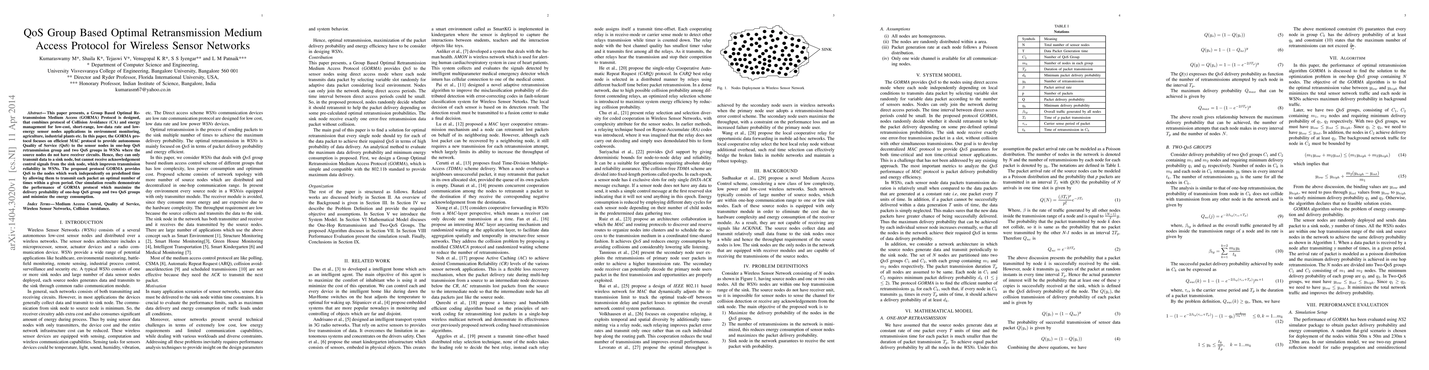This paper introduces the GORMA Protocol, a Group Based Optimal Retransmission Medium Access protocol that combines collision avoidance and energy management for low-energy sensor nodes. The protocol maximizes delivery probability and minimizes energy consumption while providing QoS for one-hop and two QoS groups in wireless sensor networks.