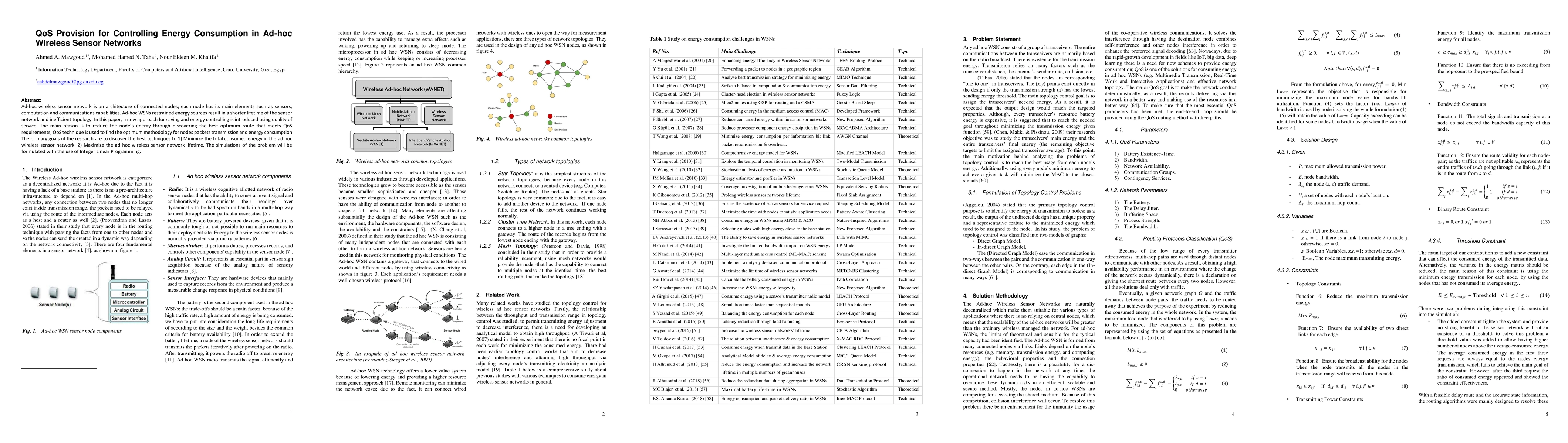 This paper proposes a method to control energy consumption in ad-hoc wireless sensor networks using Quality of Service (QoS), aiming to reduce node energy through efficient route discovery and packet transmission.