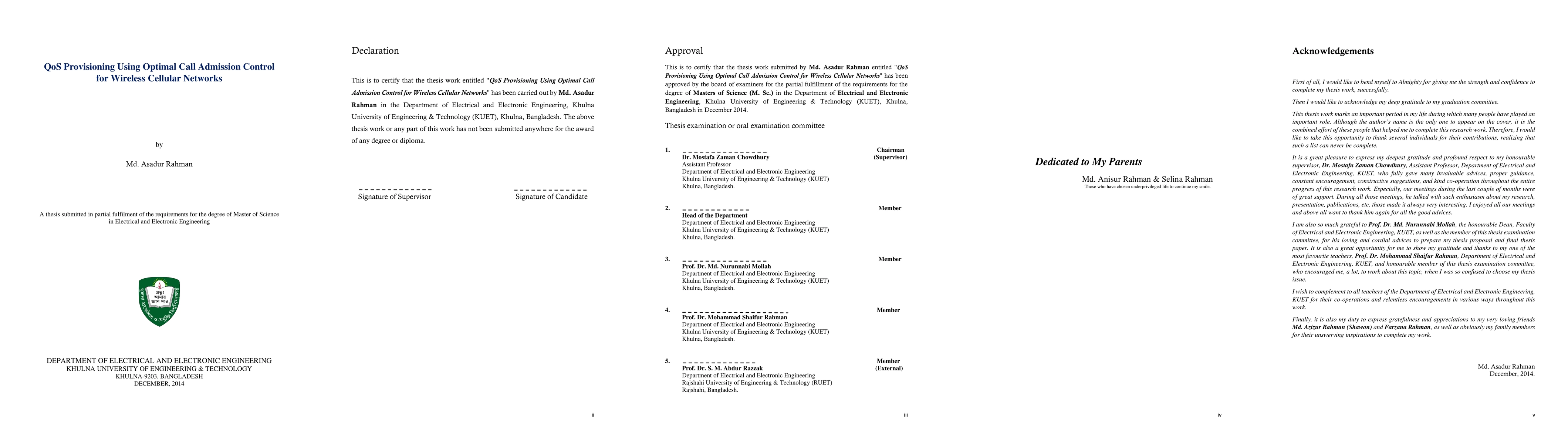 The increasing demand for advanced services in wireless networks raises the problem for quality of service (QoS) provisioning with proper resource management. In this research, such a provisioning technique for wireless networks is performed by Call Admission Control (CAC). A new approach in CAC named by Uniform Fractional Band (UFB) is proposed in this work for the wireless networks for providing proper priority between new calls and handover calls. This UFB scheme is basically a new style of handover priority scheme. Handover priority is provided by two stages in this scheme which help the network to utilize more resources. In addition, the handover call rate estimation and its impact on QoS provisioning is discussed widely to attain the optimum QoS in proposed handover priority scheme. In multiple services providing wireless network, excessive call blocking of lower priority traffic is very often event at very high traffic rate which is a concerning issue for QoS provisioning. To attain such QoS provisioning for multiple services, another CAC scheme is proposed in this research work. This scheme is recognized by Uniform Band Thinning (UBT) scheme which is based on uniform thinning technique (UTT) and this is quite similar idea as UFB scheme. In this scheme, a set of channels experiences the fractionizing policy. This scheme reduces the call blocking probabilities (CBP) of lower priority traffic classes without notably increasing the CBP of the higher priority traffic classes. The analytical functions of this scheme are deduced in general form which is useful to deduce for any number of traffic classes. In addition, numerical analysis of the proposed UBT scheme shows that the performances in terms of call blocking probability, overall call blocking probability, and channel utilization are improved and optimized compared to the conventional fixed guard channel scheme.