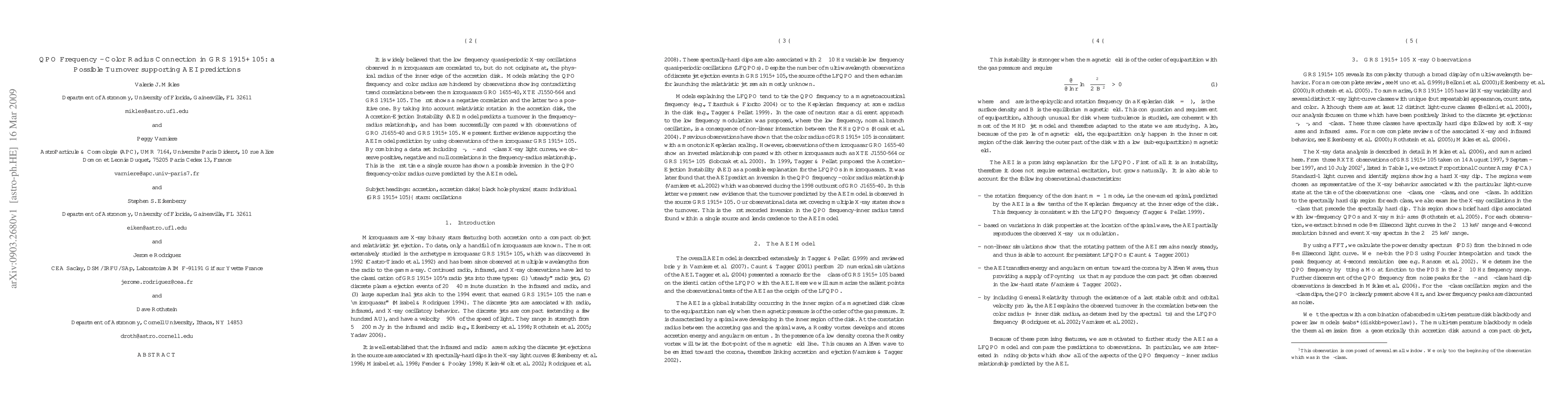 It is widely believed that the low frequency quasi-periodic X-ray oscillations observed in microquasars are correlated to, but do not originate at, the physical radius of the inner edge of the accretion disk. Models relating the QPO frequency and color radius are hindered by observations showing contradicting trend correlations between the microquasars GRO 1655-40, XTE J1550-564 and GRS 1915+105. The first shows a negative correlation and the latter two a positive one. By taking into account relativistic rotation in the accretion disk, the Accretion-Ejection Instability (AEI) model predicts a turnover in the frequency-radius relationship, and has been successfully compared with observations of GRO J1655-40 and GRS 1915+105. We present further evidence supporting the AEI model prediction by using observations of the microquasar GRS 1915+105. By combining a data set including $\theta$-, $\beta$- and $\alpha$-class X-ray light curves, we observe positive, negative and null correlations in the frequency-radius relationship. This is the first time a single source has shown a possible inversion in the QPO frequency-color radius curve predicted by the AEI model.
