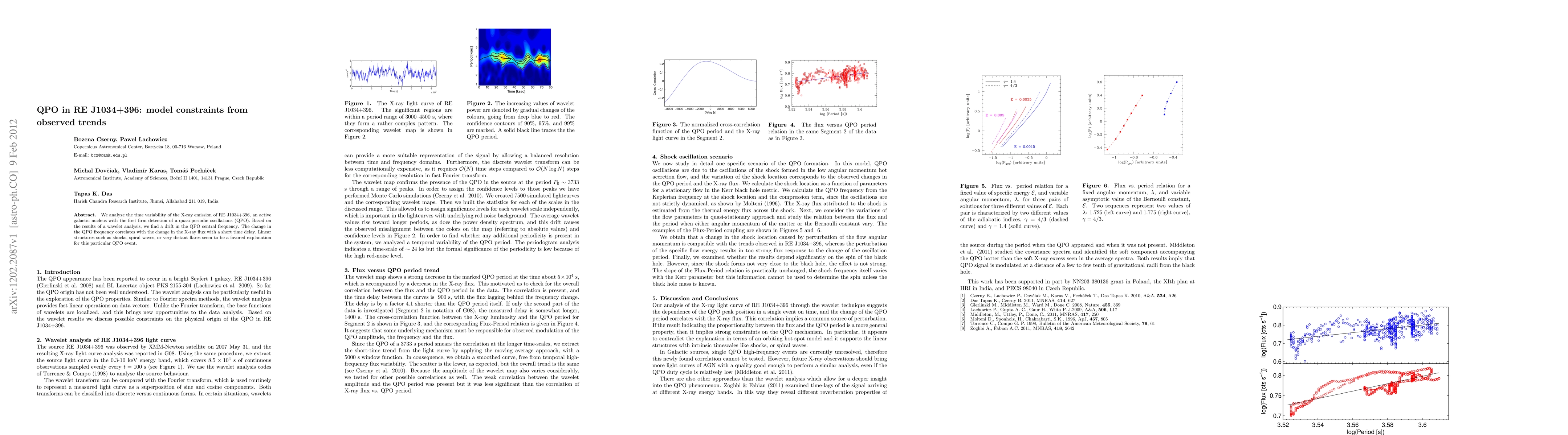 We analyze the time variability of the X-ray emission of RE J1034+396, an active galactic nucleus with the first firm detection of a quasi-periodic oscillations (QPO). Based on the results of a wavelet analysis, we find a drift in the QPO central frequency. The change inthe QPO frequency correlates with the change in the X-ray flux with a short time delay. Linear structures such as shocks, spiral waves, orvery distant flares seem to be a favored explanation for this particular QPO event.