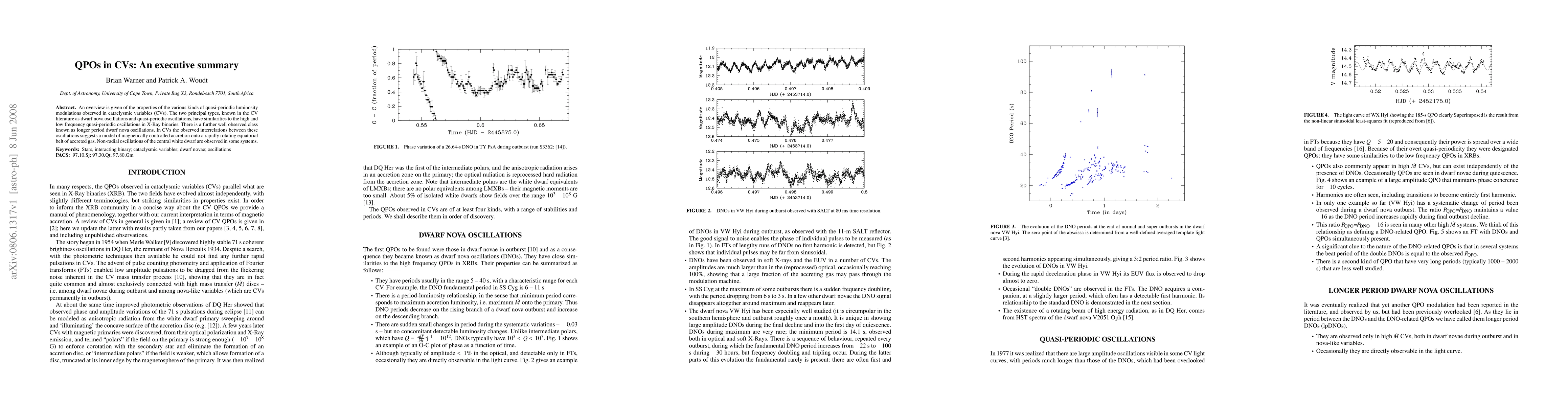 An overview is given of the properties of the various kinds of quasi-periodic luminosity modulations observed in cataclysmic variables (CVs). The two principal types, known in the CV literature as dwarf nova oscillations and quasi-periodic oscillations, have similarities to the high and low frequency quasi-periodic oscillations in X-Ray binaries. There is a further well observed class known as longer period dwarf nova oscillations. In CVs the observed interrelations between these oscillations suggests a model of magnetically controlled accretion onto a rapidly rotating equatorial belt of accreted gas. Non-radial oscillations of the central white dwarf are observed in some systems.