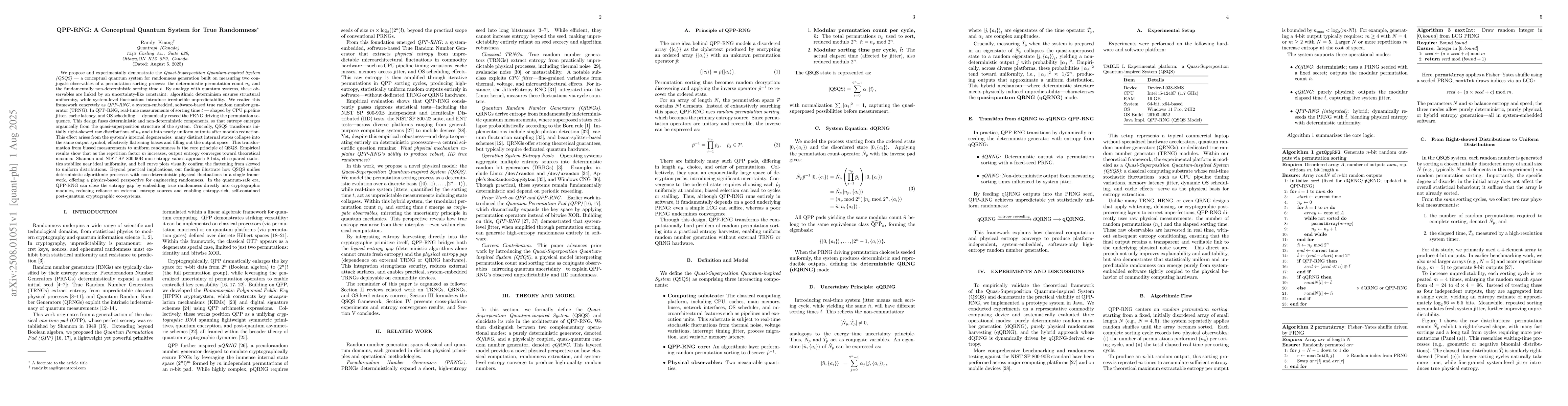 We propose and experimentally demonstrate the \emph{Quasi-Superposition Quantum-inspired System (QSQS)} -- a conceptual quantum system for randomness generation built on measuring two conjugate observables of a permutation sorting process: the deterministic permutation count $n_p$ and the fundamentally non-deterministic sorting time $t$. By analogy with quantum systems, these observables are linked by an uncertainty-like constraint: algorithmic determinism ensures structural uniformity, while system-level fluctuations introduce irreducible unpredictability. We realize this framework concretely as \emph{QPP-RNG}, a system-embedded, software-based true random number generator (TRNG). In QPP-RNG, real-time measurements of sorting time $t$ -- shaped by CPU pipeline jitter, cache latency, and OS scheduling -- dynamically reseed the PRNG driving the permutation sequence. Crucially, QSQS transforms initially right-skewed raw distributions of $n_p$ and $t$ into nearly uniform outputs after modulo reduction, thanks to internal degeneracies that collapse many distinct states into the same output symbol. Empirical results show that as the repetition factor $m$ increases, output entropy converges toward theoretical maxima: Shannon and min-entropy values approach 8 bits, chi-squared statistics stabilize near ideal uniformity, and bell curves visually confirm the flattening from skewed to uniform distributions. Beyond practical implications, QSQS unifies deterministic algorithmic processes with non-deterministic physical fluctuations, offering a physics-based perspective for engineering true randomness in post-quantum cryptographic systems.