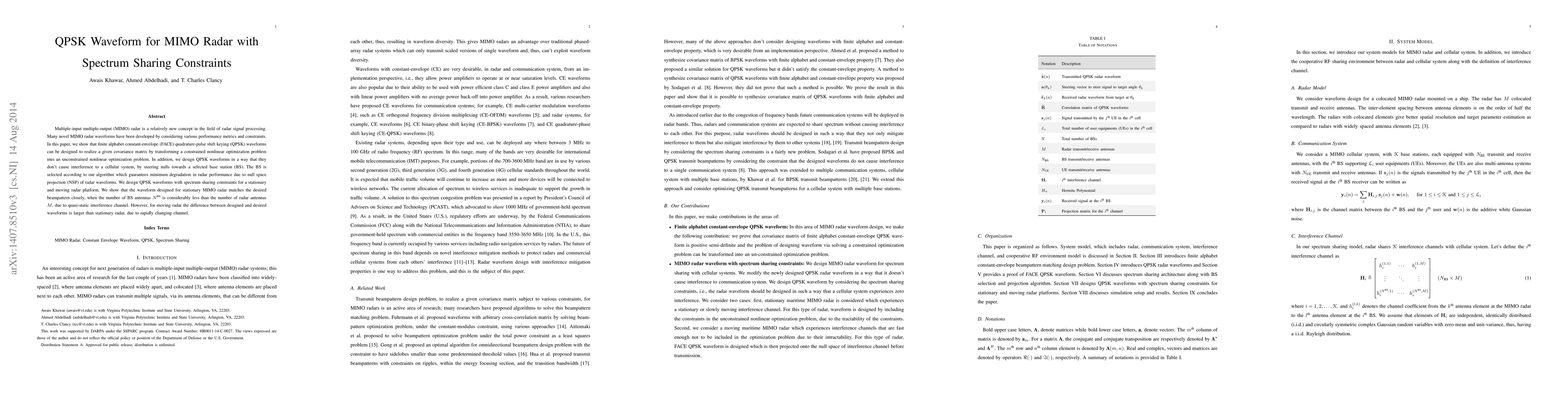 This paper proposes the design of QPSK waveforms for MIMO radar that meet spectrum sharing constraints without interfering with cellular systems. The authors transform the optimization problem into an unconstrained form and strategically steer nulls to selected base stations, ensuring minimal radar performance degradation. The designed waveforms are tested for both stationary and moving radar platforms, showing better alignment with desired beampatterns for stationary configurations.