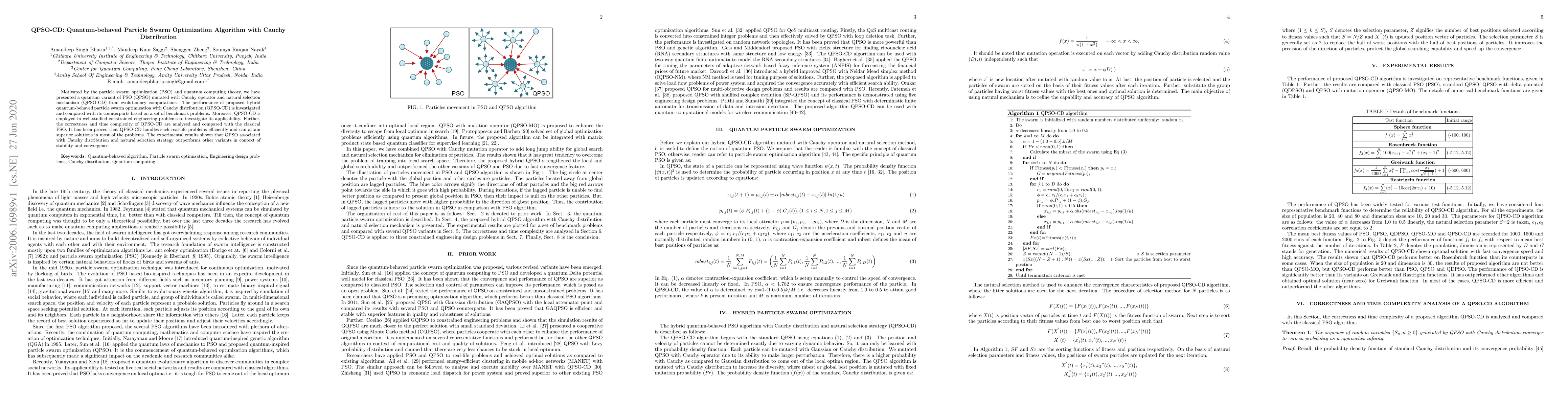 The paper introduces QPSO-CD, a hybrid quantum-behaved particle swarm optimization algorithm enhanced with a Cauchy distribution and natural selection mechanism, demonstrating superior performance in solving benchmark and constrained engineering problems compared to classical PSO. Experimental results indicate that QPSO-CD achieves better stability and convergence rates.