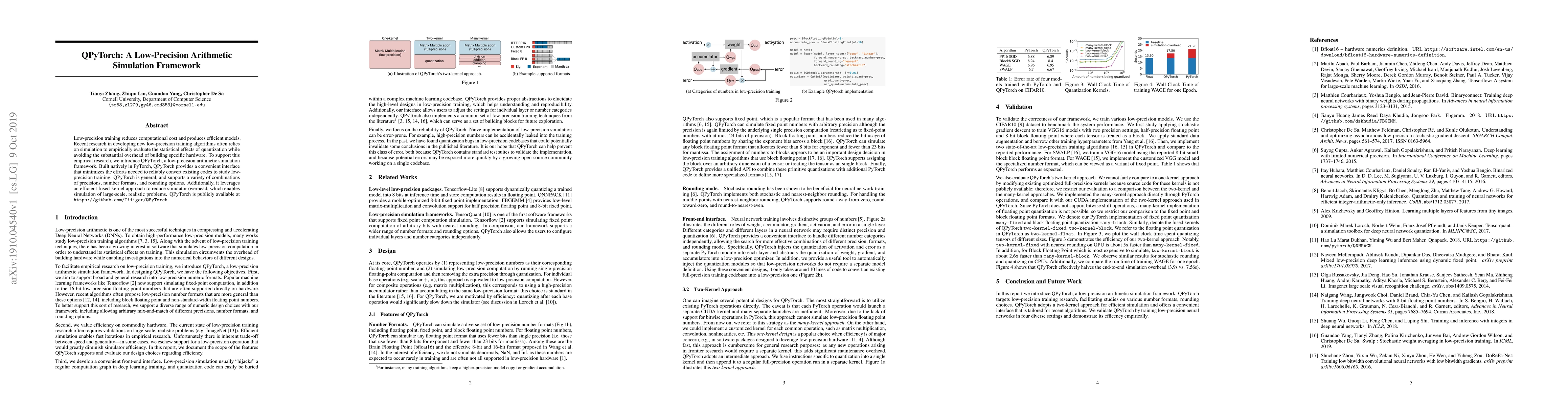 QPyTorch is a low-precision arithmetic simulation framework built in PyTorch to facilitate empirical research on low-precision training algorithms, minimizing overhead and enabling efficient simulation of large-scale problems. It supports various precisions, number formats, and rounding options.