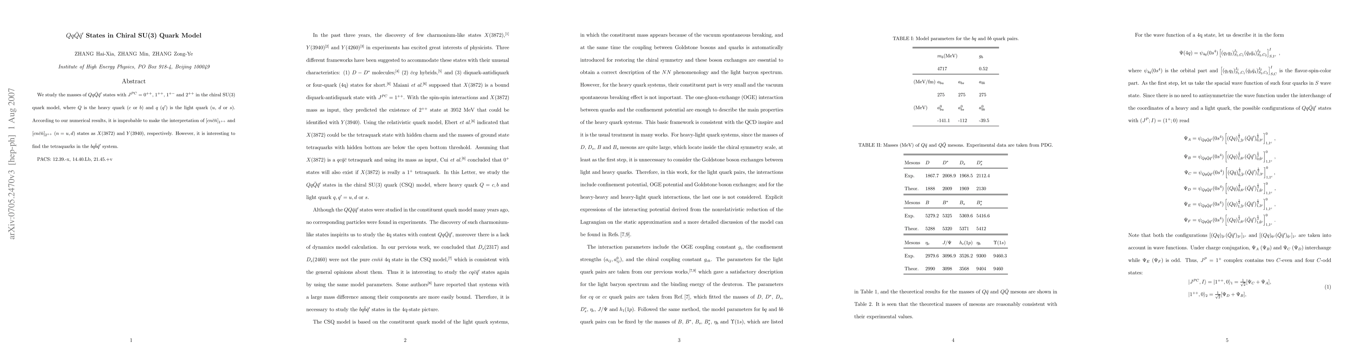 In this work, we study the masses of $Qq\bar Q\bar q'$ states with J^{PC}=0^{++}, 1^{++}, 1^{+-} and 2^{++} in the chiral SU(3) quark model, where Q is the heavy quark (c or b) and q (q') is the light quark (u, d or s). According to our numerical results, it is improbable to make the interpretation of $[cn\bar c\bar n]_{1^{++}}$ and $[cn\bar c\bar n]_{2^{++}}$ (n=u, d) states as X(3872) and Y(3940), respectively. However, it is interesting to find the tetraquarks in the $bq\bar b\bar q'$ system.
