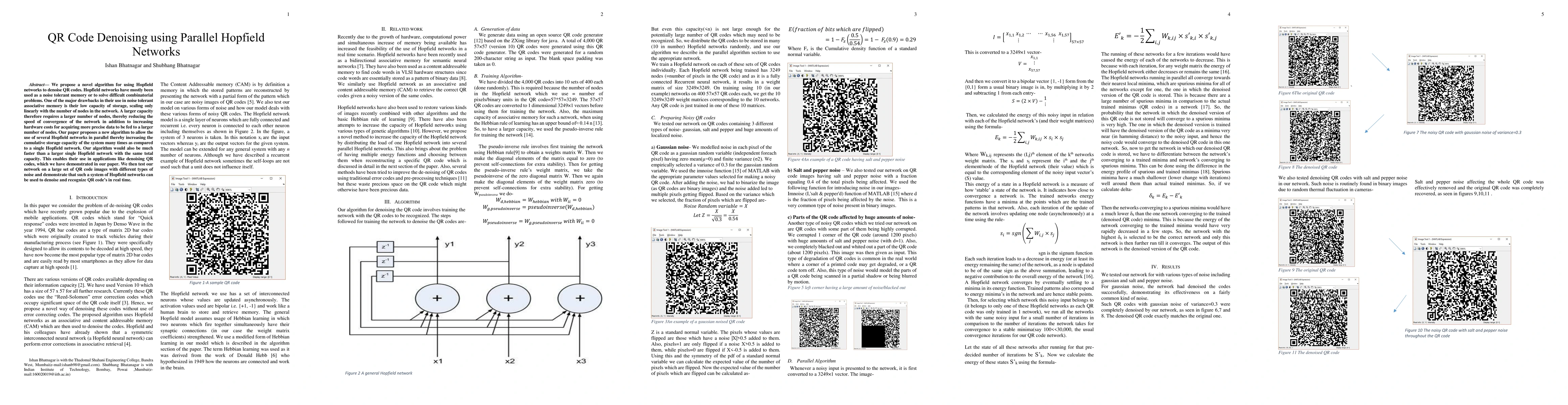 We propose a novel algorithm for using Hopfield networks to denoise QR codes. Hopfield networks have mostly been used as a noise tolerant memory or to solve difficult combinatorial problems. One of the major drawbacks in their use in noise tolerant associative memory is their low capacity of storage, scaling only linearly with the number of nodes in the network. A larger capacity therefore requires a larger number of nodes, thereby reducing the speed of convergence of the network in addition to increasing hardware costs for acquiring more precise data to be fed to a larger number of nodes. Our paper proposes a new algorithm to allow the use of several Hopfield networks in parallel thereby increasing the cumulative storage capacity of the system many times as compared to a single Hopfield network. Our algorithm would also be much faster than a larger single Hopfield network with the same total capacity. This enables their use in applications like denoising QR codes, which we have demonstrated in our paper. We then test our network on a large set of QR code images with different types of noise and demonstrate that such a system of Hopfield networks can be used to denoise and recognize QR codes in real time.
