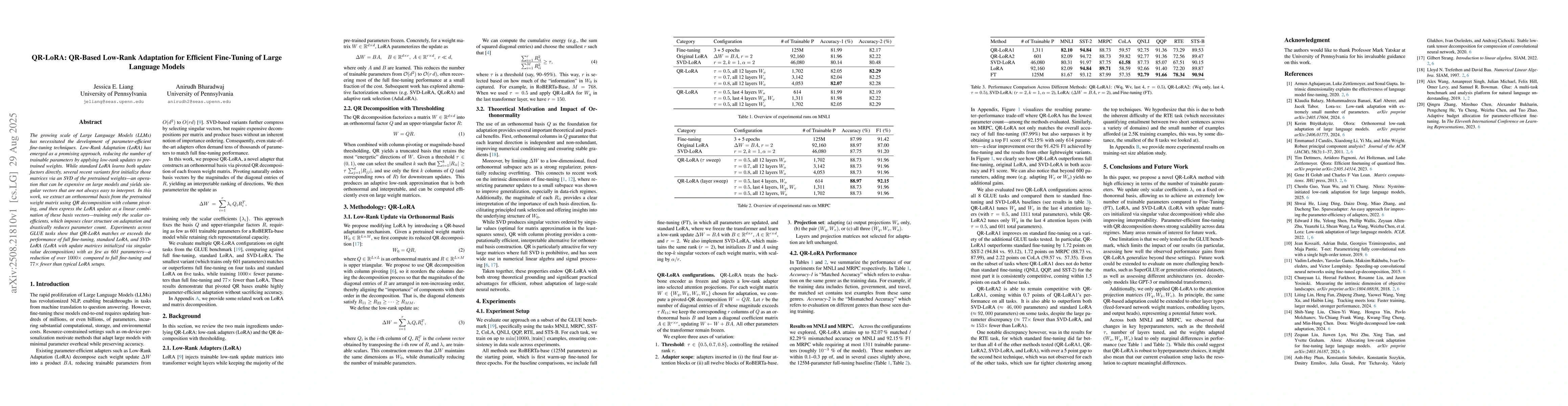 The growing scale of Large Language Models (LLMs) has necessitated the development of parameter-efficient fine-tuning techniques. Low-Rank Adaptation (LoRA) has emerged as a promising approach, reducing the number of trainable parameters by applying low-rank updates to pretrained weights. While standard LoRA learns both update factors directly, several recent variants first initialize those matrices via an SVD of the pretrained weights -- an operation that can be expensive on large models and yields singular vectors that are not always easy to interpret. In this work, we extract an orthonormal basis from the pretrained weight matrix using QR decomposition with column pivoting, and then express the LoRA update as a linear combination of these basis vectors -- training only the scalar coefficients, which imposes clear structure on adaptation and drastically reduces parameter count. Experiments across GLUE tasks show that QR-LoRA matches or exceeds the performance of full fine-tuning, standard LoRA, and SVD-LoRA (LoRA with update matrices initialized via singular value decomposition) with as few as 601 parameters -- a reduction of over 1000x compared to full fine-tuning and 77x fewer than typical LoRA setups.