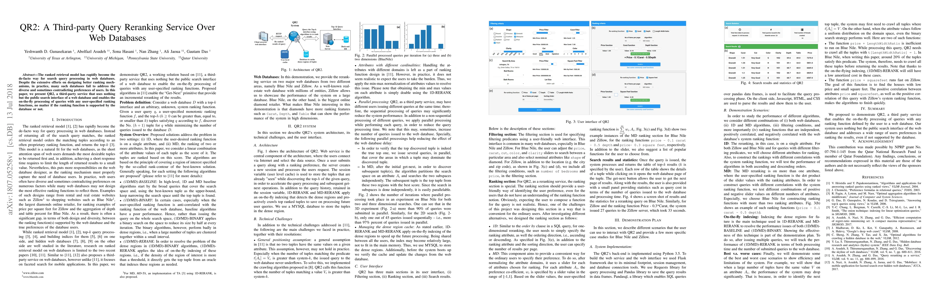 QR2 is a third-party query reranking service that leverages a web database's public search interface to apply custom ranking functions on retrieved results, addressing the limitations of built-in database ranking mechanisms. It allows users to specify their own ranking preferences without needing database support for those functions.