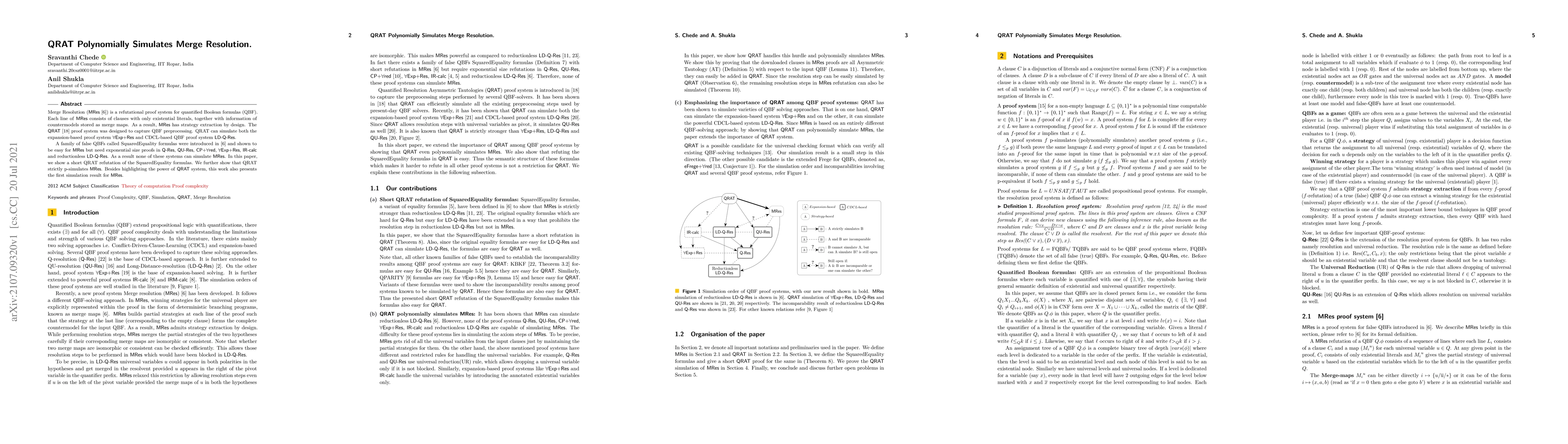 Merge Resolution (MRes [Beyersdorff et al. J. Autom. Reason.'2021] ) is a refutational proof system for quantified Boolean formulas (QBF). Each line of MRes consists of clauses with only existential literals, together with information of countermodels stored as merge maps. As a result, MRes has strategy extraction by design. The QRAT [Heule et al. J. Autom. Reason.'2017] proof system was designed to capture QBF preprocessing. QRAT can simulate both the expansion-based proof system $\forall$Exp+Res and CDCL-based QBF proof system LD-Q-Res. A family of false QBFs called SquaredEquality formulas were introduced in [Beyersdorff et al. J. Autom. Reason.'2021] and shown to be easy for MRes but need exponential size proofs in Q-Res, QU-Res, CP+$\forall$red, $\forall$Exp+Res, IR-calc and reductionless LD-Q-Res. As a result none of these systems can simulate MRes. In this paper, we show a short QRAT refutation of the SquaredEquality formulas. We further show that QRAT strictly p-simulates MRes. Besides highlighting the power of QRAT system, this work also presents the first simulation result for MRes.