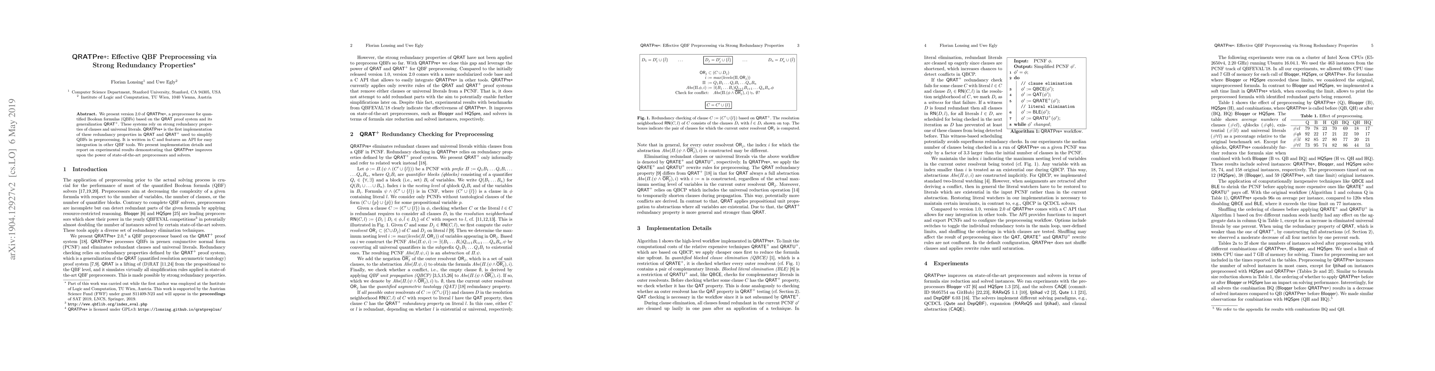 The introduction of a new QBF redundancy property, QRAT+, which enables more efficient preprocessing and solving