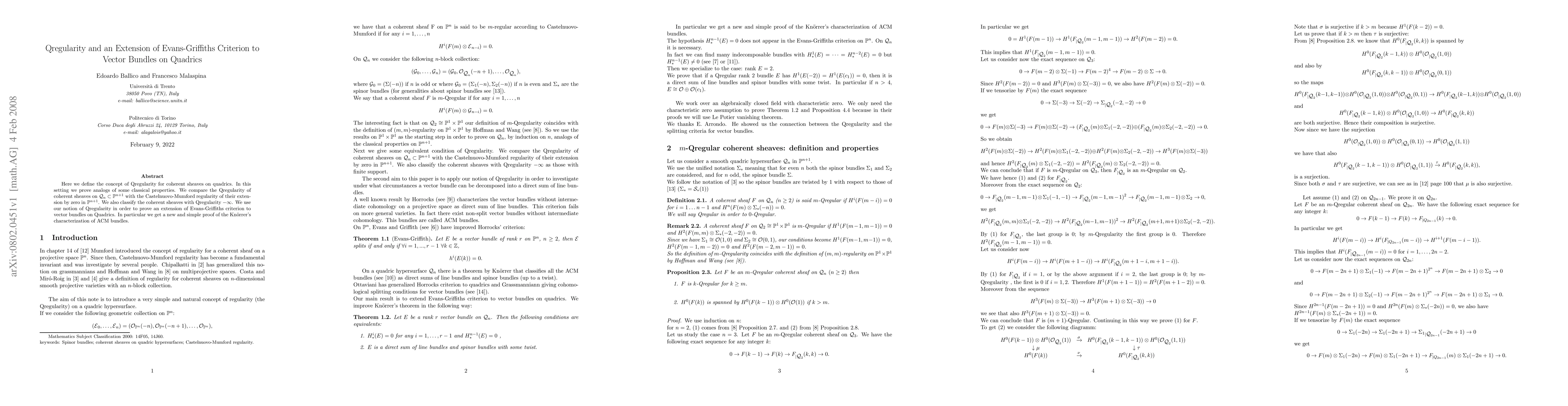 Here we define the concept of Qregularity for coherent sheaves on quadrics. In this setting we prove analogs of some classical properties. We compare the Qregularity of coherent sheaves on $\Q_n\subset \mathbb P^{n+1}$ with the Castelnuovo-Mumford regularity of their extension by zero in $\mathbb P^{n+1}$. We also classify the coherent sheaves with Qregularity $-\infty$. We use our notion of Qregularity in order to prove an extension of Evans-Griffiths criterion to vector bundles on Quadrics. In particular we get a new and simple proof of the Kn\"{o}rrer's characterization of ACM bundles.