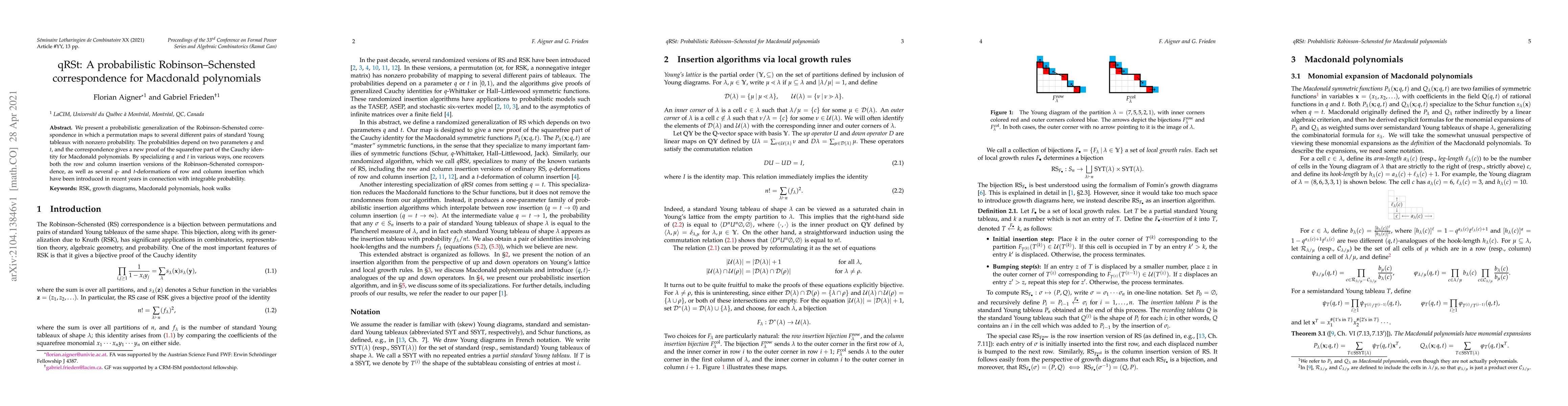 This paper introduces a probabilistic version of the Robinson-Schensted correspondence, where permutations map to multiple pairs of standard tableaux with nonzero probabilities determined by parameters $q$ and $t$. It provides a new proof for the squarefree part of the Cauchy identity for Macdonald polynomials and recovers various known insertion versions and deformations in integrable probability.
