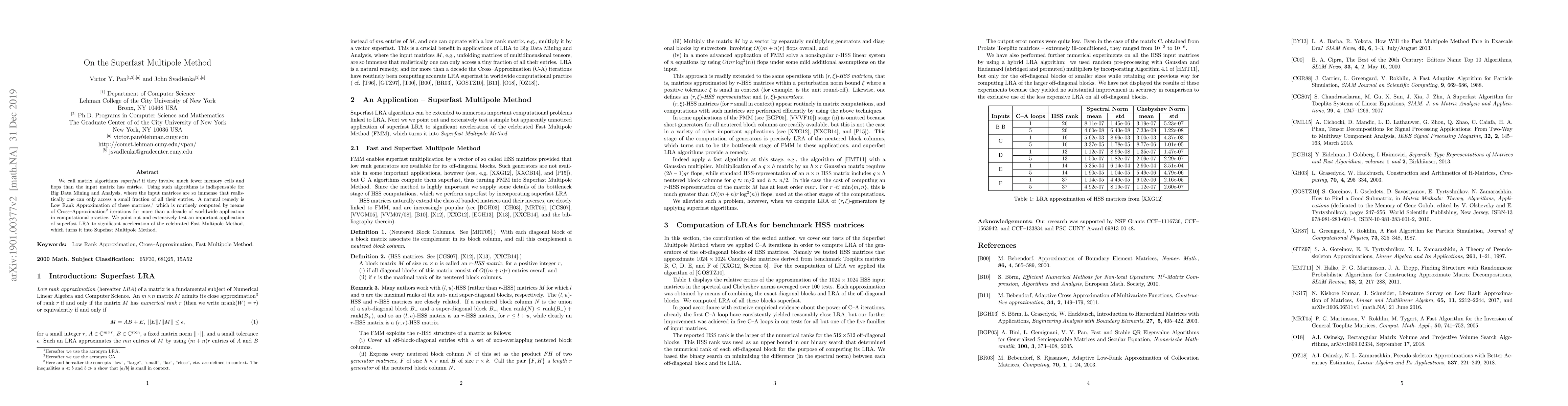 We call matrix algorithms superfast if they use much fewer flops and memory cells than the input matrix has entries. Using such algorithms is indispensable for Big Data Mining and Analysis, where the input matrices are so immense that one can only access a small fraction of all their entries. A natural remedy is Low Rank Approximation (LRA) of these matrices, which is routinely computed by means of Cross-Approximation iterations for more than a decade of worldwide application in computational practice. We point out and extensively test an important application of superfast LRA to significant acceleration of the celebrated Fast Multipole Method, which turns it into Superfast Multipole Method.