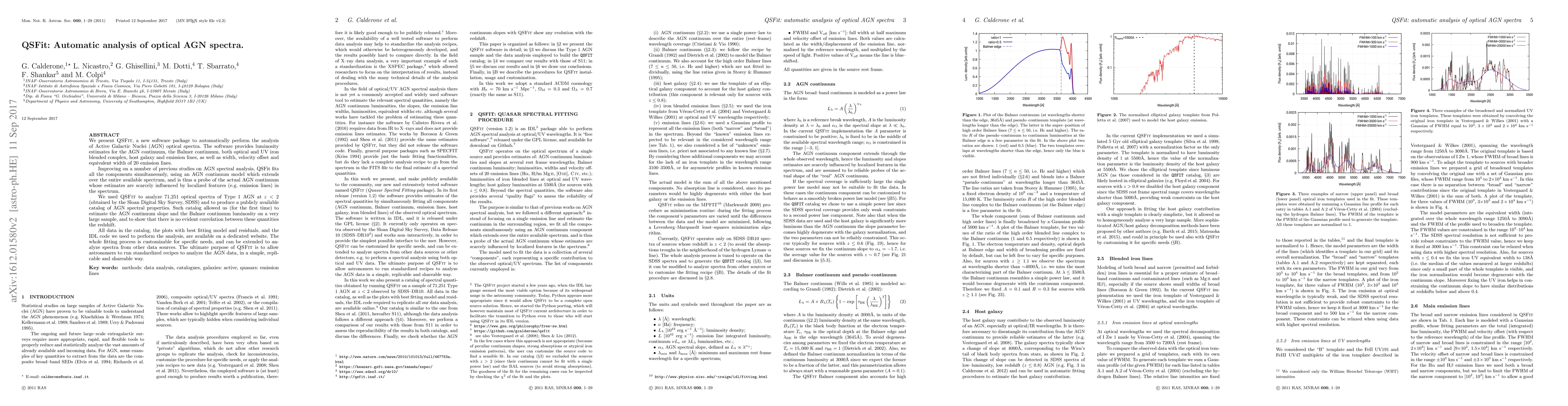 We present QSFit, a new software package to automatically perform the analysis of Active Galactic Nuclei (AGN) optical spectra. The software provides luminosity estimates for the AGN continuum, the Balmer continuum, both optical and UV iron blended complex, host galaxy and emission lines, as well as width, velocity offset and equivalent width of 20 emission lines. Improving on a number of previous studies on AGN spectral analysis, QSFit fits all the components simultaneously, using an AGN continuum model which extends over the entire available spectrum, and is thus a probe of the actual AGN continuum whose estimates are scarcely influenced by localized features (e.g. emission lines) in the spectrum. We used QSFit to analyze 71,251 optical spectra of Type 1 AGN at z < 2 (obtained by the Sloan Digital Sky Survey, SDSS) and to produce a publicly available catalog of AGN spectral properties. Such catalog allowed us (for the first time) to estimate the AGN continuum slope and the Balmer continuum luminosity on a very large sample, and to show that there is no evident correlation between these quantities the redshift. All data in the catalog, the plots with best fitting model and residuals, and the IDL code we used to perform the analysis, are available on a dedicated website. The whole fitting process is customizable for specific needs, and can be extended to analyze spectra from other data sources. The ultimate purpose of QSFit is to allow astronomers to run standardized recipes to analyze the AGN data, in a simple, replicable and shareable way.