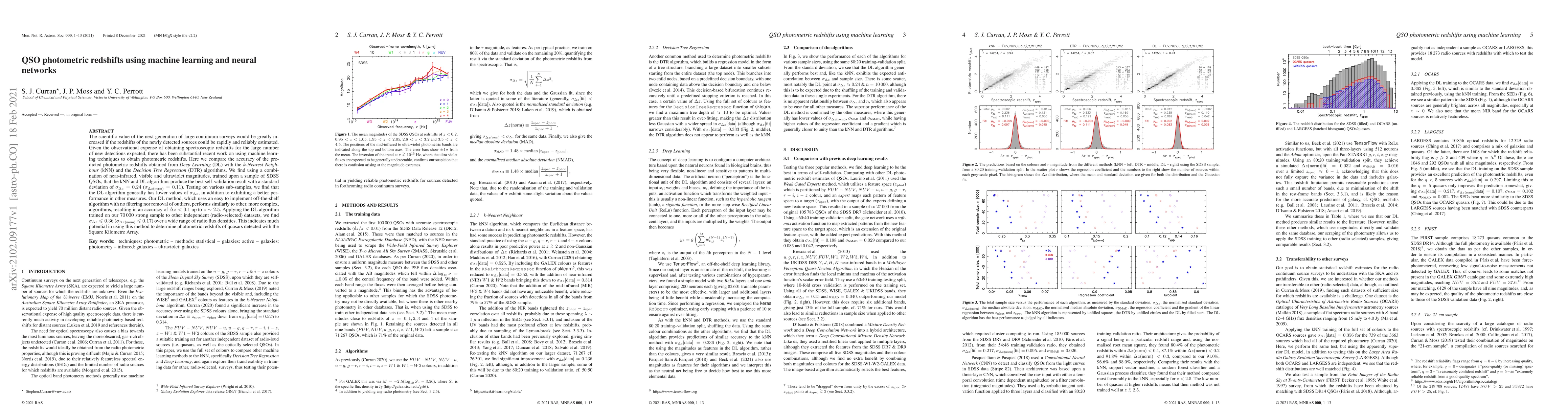 The scientific value of the next generation of large continuum surveys would be greatly increased if the redshifts of the newly detected sources could be rapidly and reliably estimated. Given the observational expense of obtaining spectroscopic redshifts for the large number of new detections expected, there has been substantial recent work on using machine learning techniques to obtain photometric redshifts. Here we compare the accuracy of the predicted photometric redshifts obtained from Deep Learning(DL) with the k-Nearest Neighbour (kNN) and the Decision Tree Regression (DTR) algorithms. We find using a combination of near-infrared, visible and ultraviolet magnitudes, trained upon a sample of SDSS QSOs, that the kNN and DL algorithms produce the best self-validation result with a standard deviation of {\sigma} = 0.24. Testing on various sub-samples, we find that the DL algorithm generally has lower values of {\sigma}, in addition to exhibiting a better performance in other measures. Our DL method, which uses an easy to implement off-the-shelf algorithm with no filtering nor removal of outliers, performs similarly to other, more complex, algorithms, resulting in an accuracy of {\Delta}z < 0.1$ up to z ~ 2.5. Applying the DL algorithm trained on our 70,000 strong sample to other independent (radio-selected) datasets, we find {\sigma} < 0.36 over a wide range of radio flux densities. This indicates much potential in using this method to determine photometric redshifts of quasars detected with the Square Kilometre Array.