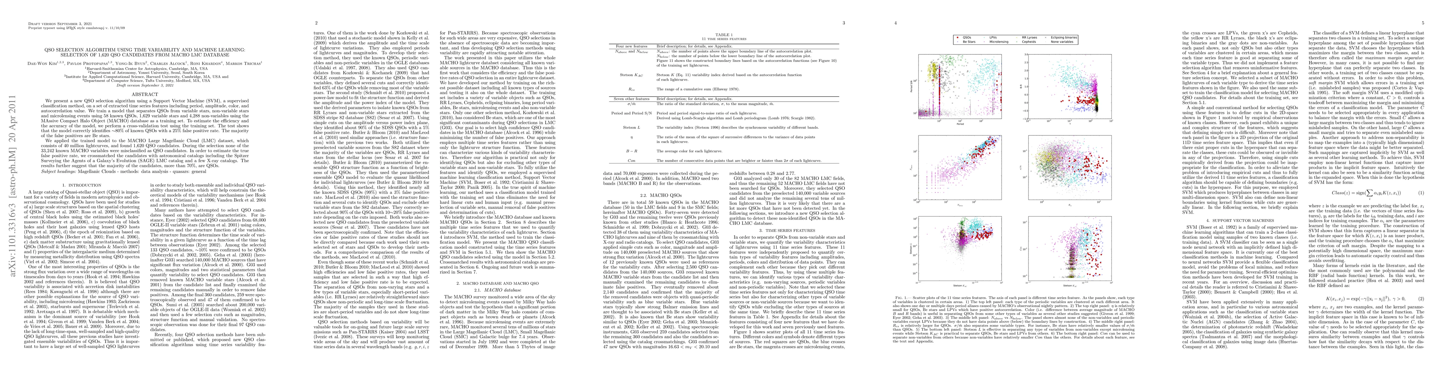 We present a new QSO selection algorithm using a Support Vector Machine (SVM), a supervised classification method, on a set of extracted times series features including period, amplitude, color, and autocorrelation value. We train a model that separates QSOs from variable stars, non-variable stars and microlensing events using 58 known QSOs, 1,629 variable stars and 4,288 non-variables using the MAssive Compact Halo Object (MACHO) database as a training set. To estimate the efficiency and the accuracy of the model, we perform a cross-validation test using the training set. The test shows that the model correctly identifies ~80% of known QSOs with a 25% false positive rate. The majority of the false positives are Be stars. We applied the trained model to the MACHO Large Magellanic Cloud (LMC) dataset, which consists of 40 million lightcurves, and found 1,620 QSO candidates. During the selection none of the 33,242 known MACHO variables were misclassified as QSO candidates. In order to estimate the true false positive rate, we crossmatched the candidates with astronomical catalogs including the Spitzer Surveying the Agents of a Galaxy's Evolution (SAGE) LMC catalog and a few X-ray catalogs. The results further suggest that the majority of the candidates, more than 70%, are QSOs.