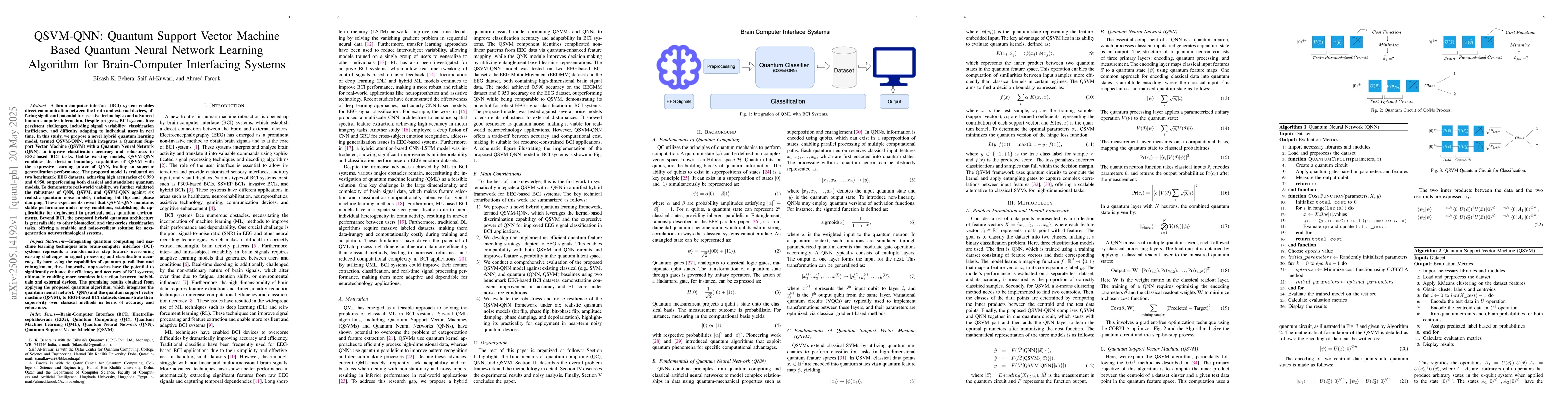 The research proposes a hybrid quantum learning model, QSVM-QNN, combining Quantum Support Vector Machine (QSVM) with Quantum Neural Network (QNN) for BCI tasks.