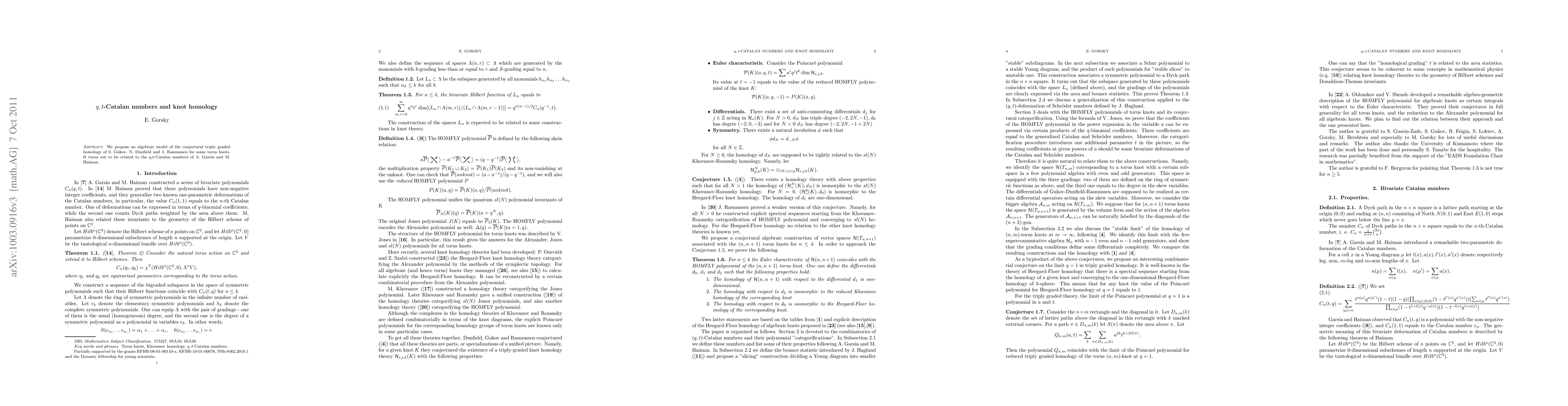 Summary: This paper proposes an algebraic model for the conjectural triply graded homology of torus knots, revealing a connection to the q,t-Catalan numbers developed by Garsia and Haiman. The findings suggest a novel relationship between knot theory and combinatorial algebra.