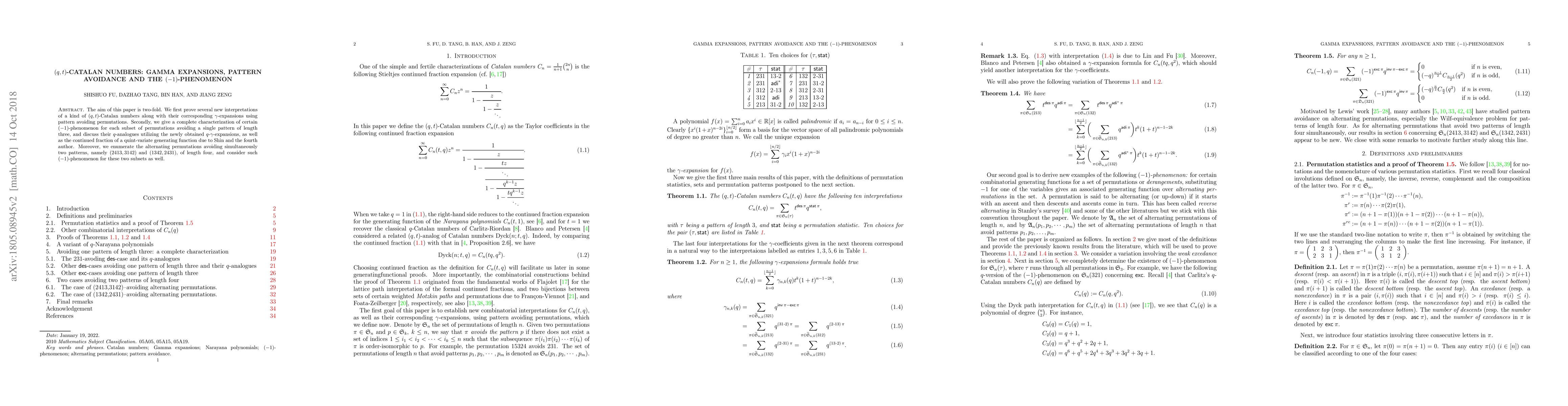 The aim of this paper is two-fold. We first prove several new interpretations of a kind of $(q,t)$-Catalan numbers along with their corresponding $\gamma$-expansions using pattern avoiding permutations. Secondly, we give a complete characterization of certain $(-1)$-phenomenon for each subset of permutations avoiding a single pattern of length three, and discuss their $q$-analogues utilizing the newly obtained $q$-$\gamma$-expansions, as well as the continued fraction of a quint-variate generating function due to Shin and the fourth author. Moreover, we enumerate the alternating permutations avoiding simultaneously two patterns, namely $(2413,3142)$ and $(1342,2431)$, of length four, and consider such $(-1)$-phenomenon for these two subsets as well.