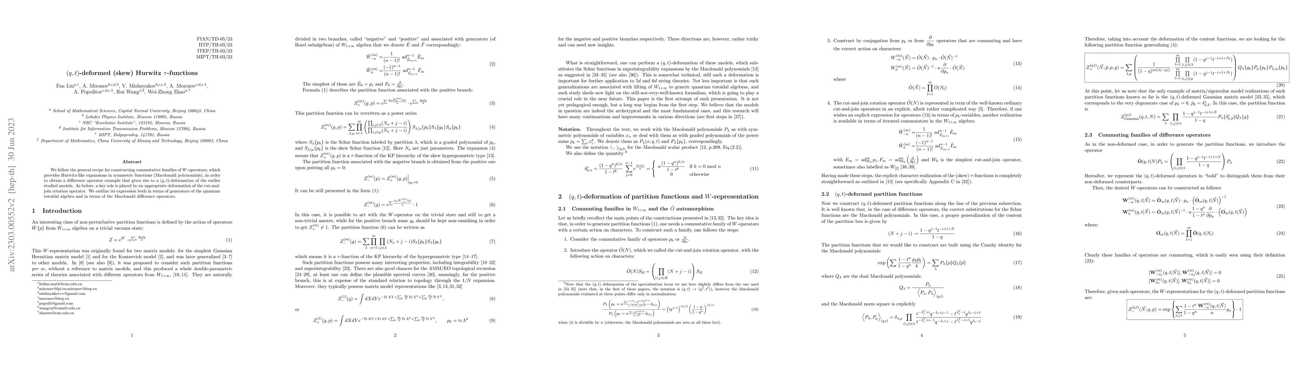 We follow the general recipe for constructing commutative families of $W$-operators, which provides Hurwitz-like expansions in symmetric functions (Macdonald polynomials), in order to obtain a difference operator example that gives rise to a $(q,t)$-deformation of the earlier studied models. As before, a key role is played by an appropriate deformation of the cut-and-join rotation operator. We outline its expression both in terms of generators of the quantum toroidal algebra and in terms of the Macdonald difference operators.
