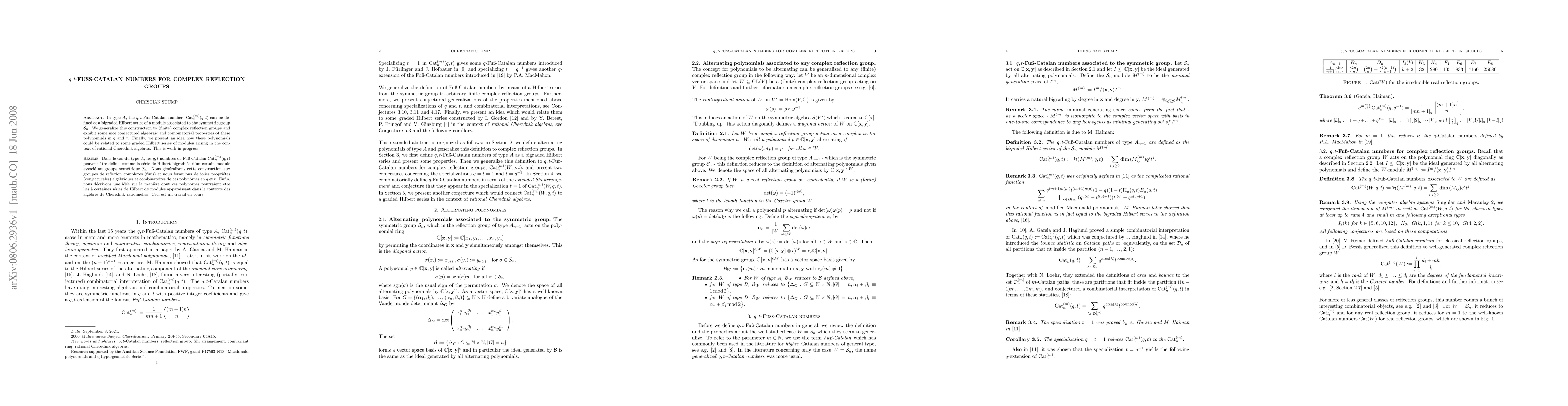 In type A, the q,t-Fuss -Catalan numbers can be defined as a bigraded Hilbert series of a module associated to the symmetric group S_n. We generalize this construction to (finite) complex reflection groups and exhibit some nice conjectured algebraic and combinatorial properties of these polynomials in q and t. Finally, we present an idea how these polynomials could be related to some graded Hilbert series of modules arising in the context of rational Cherednik algebras. This is work in progress.