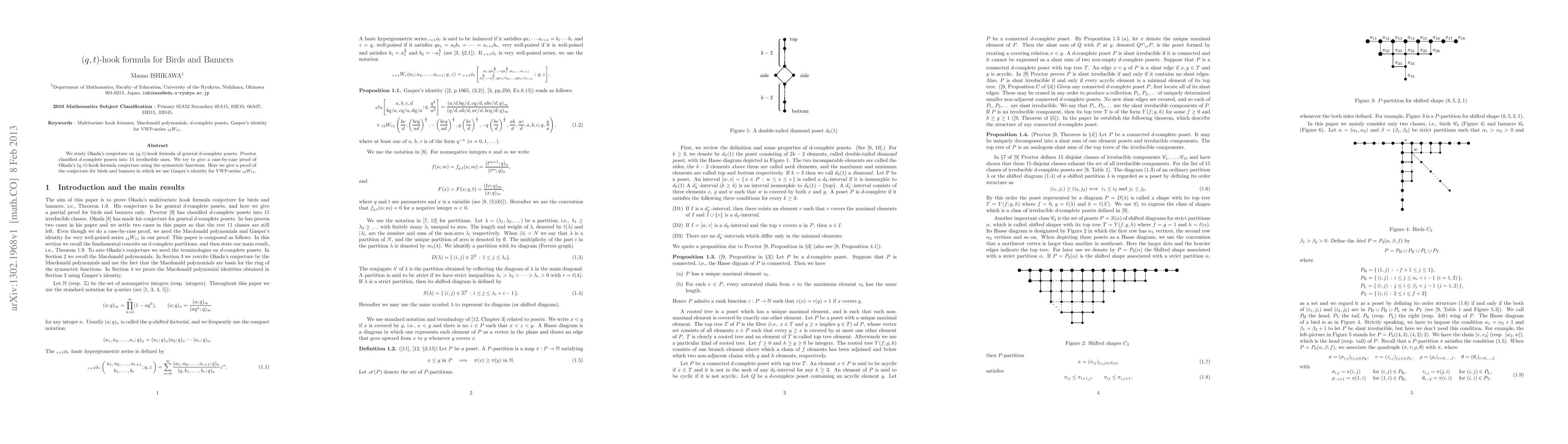 We study Okada's conjecture on $(q,t)$-hook formula of general $d$-complete posets. Proctor classified $d$-complete posets into 15 irreducible ones. We try to give a case-by-case proof of Okada's $(q,t)$-hook formula conjecture using the symmetric functions. Here we give a proof of the conjecture for birds and banners, in which we use Gasper's identity for VWP-series ${}_{12}W_{11}$.