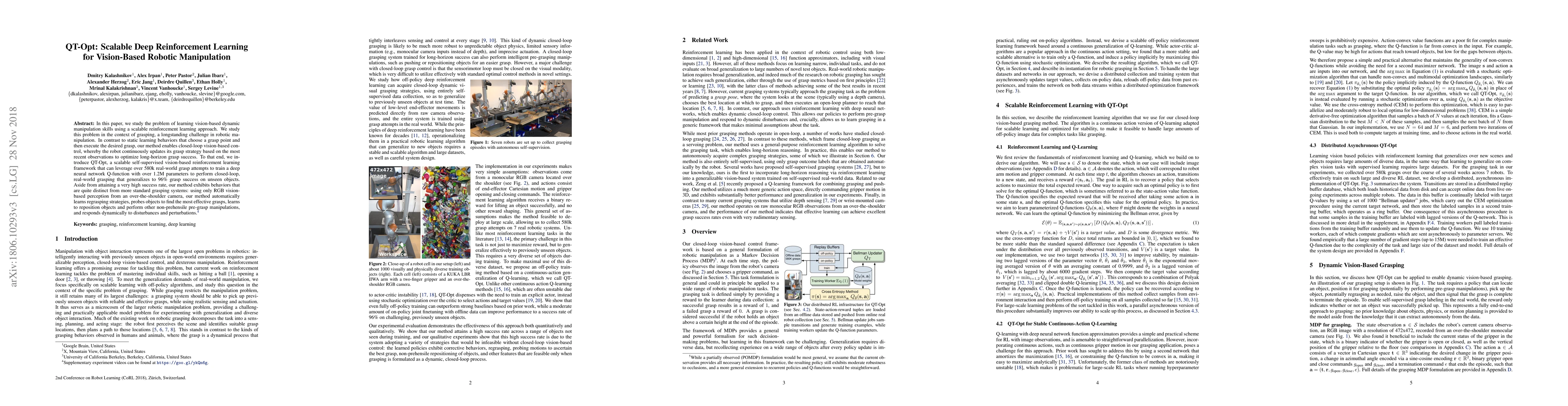 QT-Opt introduces a scalable, self-supervised reinforcement learning framework for vision-based robotic manipulation, enabling continuous, dynamic grasp strategy updates based on real-time observations. The approach achieves 96% grasp success on unseen objects by leveraging over 580k real-world grasp attempts and learning regrasping, object probing, and dynamic disturbance responses using only RGB vision.