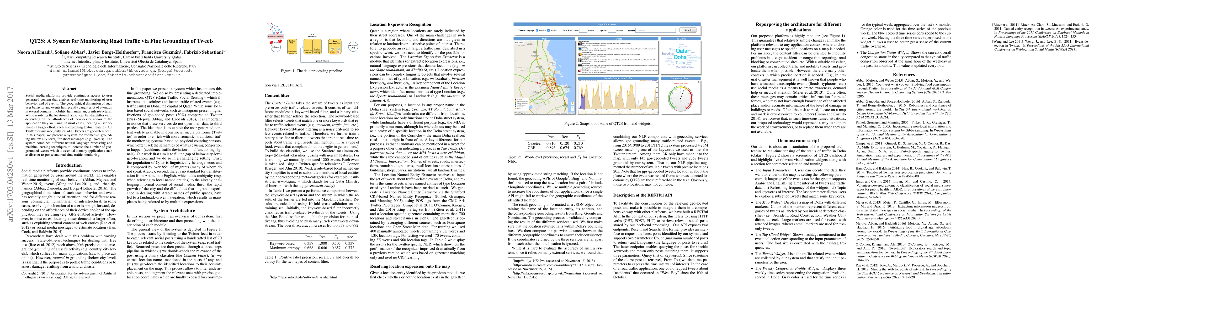 A system called QT2S improves the location of tweets to enable real-time traffic monitoring, increasing geo-grounded tweets from 2% to a significant number. The system combines NLP and machine learning techniques to achieve this.