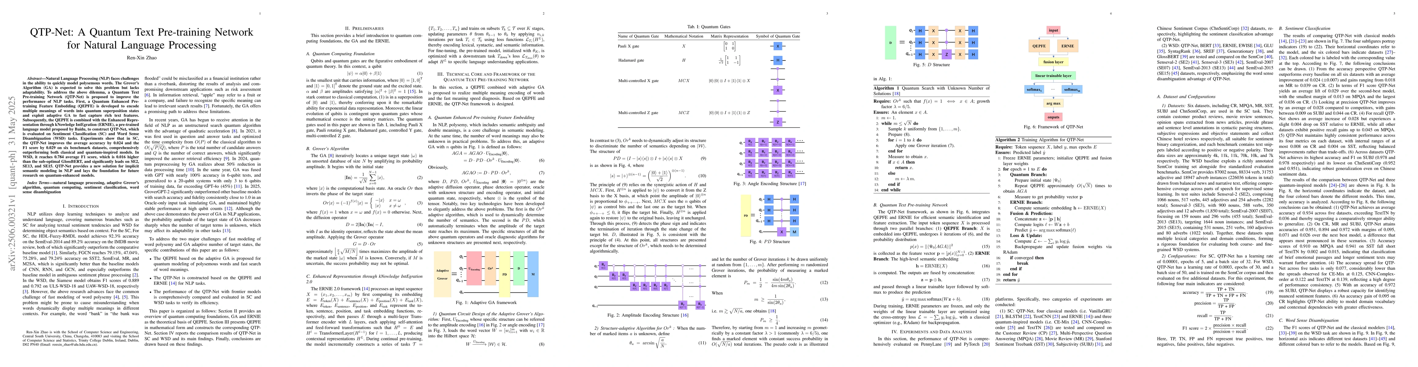 Natural Language Processing (NLP) faces challenges in the ability to quickly model polysemous words. The Grover's Algorithm (GA) is expected to solve this problem but lacks adaptability. To address the above dilemma, a Quantum Text Pre-training Network (QTP-Net) is proposed to improve the performance of NLP tasks. First, a Quantum Enhanced Pre-training Feature Embedding (QEPFE) is developed to encode multiple meanings of words into quantum superposition states and exploit adaptive GA to fast capture rich text features. Subsequently, the QEPFE is combined with the Enhanced Representation through kNowledge IntEgration (ERNIE), a pre-trained language model proposed by Baidu, to construct QTP-Net, which is evaluated on Sentiment Classification (SC) and Word Sense Disambiguation (WSD) tasks. Experiments show that in SC, the QTP-Net improves the average accuracy by 0.024 and the F1 score by 0.029 on six benchmark datasets, comprehensively outperforming both classical and quantum-inspired models. In WSD, it reaches 0.784 average F1 score, which is 0.016 higher than the sub-optimal GlossBERT, and significantly leads on SE2, SE13, and SE15. QTP-Net provides a new solution for implicit semantic modeling in NLP and lays the foundation for future research on quantum-enhanced models.