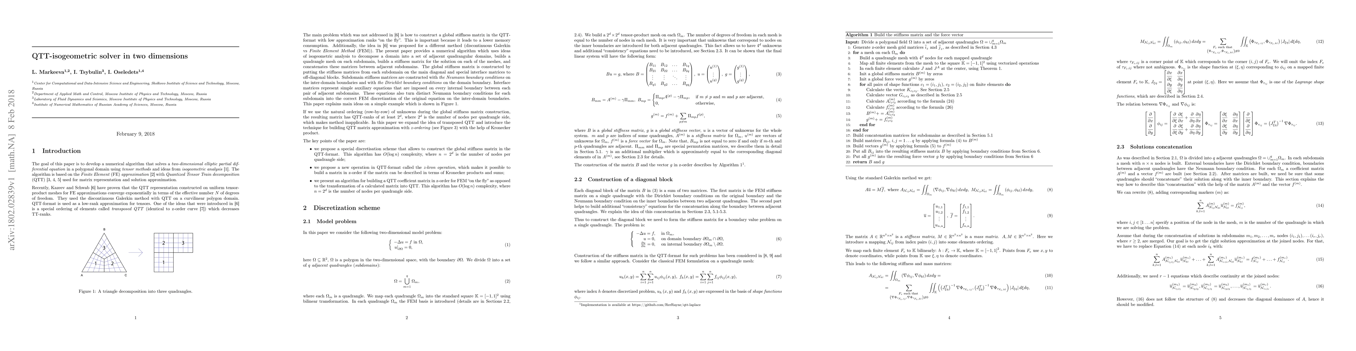 The goal of this paper is to develop a numerical algorithm that solves a two-dimensional elliptic partial differential equation in a polygonal domain using tensor methods and ideas from isogeometric analysis. The proposed algorithm is based on the Finite Element (FE) approximation with Quantized Tensor Train decomposition (QTT) used for matrix representation and solution approximation. In this paper we propose a special discretisation scheme that allows to construct the global stiffness matrix in the QTT-format. The algorithm has $O(\log n)$ complexity, where $n=2^d$ is the number of nodes per quadrangle side. A new operation called z-kron is introduced for QTT-format. It makes it possible to build a matrix in z-order if the matrix can be expressed in terms of Kronecker products and sums. An algorithm for building a QTT coefficient matrix for FEM in z-order "on the fly", as opposed to the transformation of a calculated matrix into QTT, is presented. This algorithm has $O(\log n)$ complexity for $n$ as above.