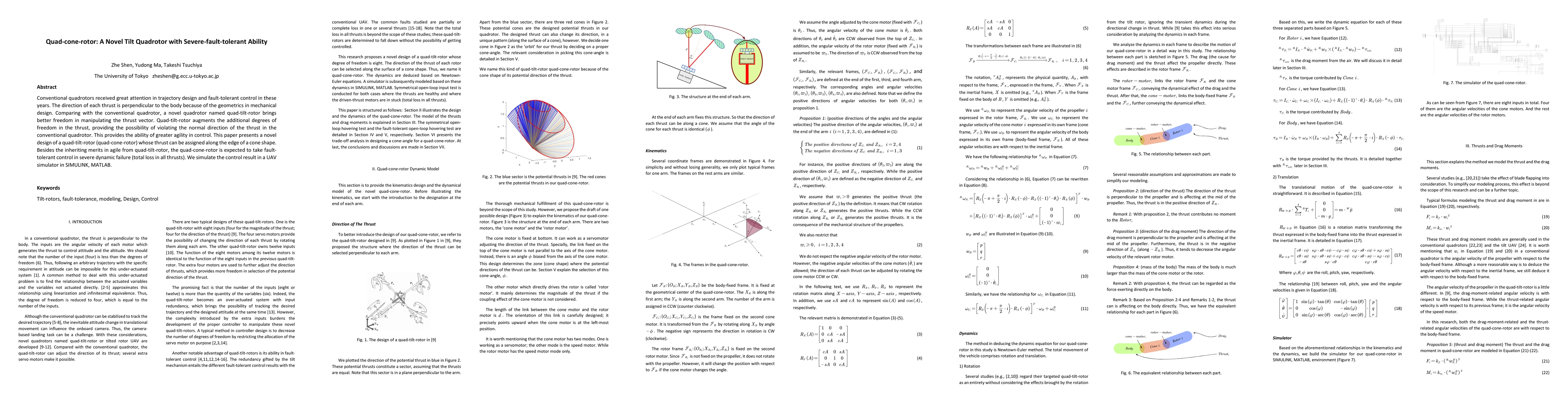 Conventional quadrotors received great attention in trajectory design and fault-tolerant control in these years. The direction of each thrust is perpendicular to the body because of the geometrics in mechanical design. Comparing with the conventional quadrotor, a novel quadrotor named quad-tilt-rotor brings better freedom in manipulating the thrust vector. Quad-tilt-rotor augments the additional degrees of freedom in the thrust, providing the possibility of violating the normal direction of the thrust in the conventional quadrotor. This provides the ability of greater agility in control. This paper presents a novel design of a quad-tilt-rotor (quad-cone-rotor) whose thrust can be assigned along the edge of a cone shape. Besides the inheriting merits in agile from quad-tilt-rotor, the quad-cone-rotor is expected to take fault-tolerant control in severe dynamic failure (total loss in all thrusts). We simulate the control result in a UAV simulator in SIMULINK, MATLAB.